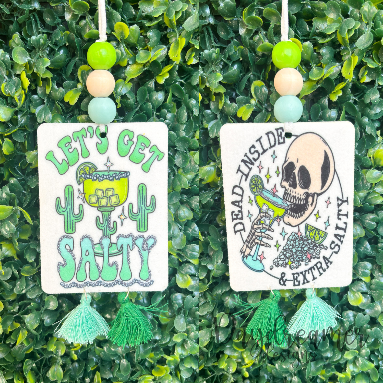 Our felt freshies are full of detail with a 2 sided print and an option for beads and tassels. Hang them in your car, office, or any small space. Once they fade, you can re-scent them with your favorite perfume, essential oil, etc. by applying them to the sides and allowing the oil/liquid to soak in. Bead, tassel, and string color may vary.