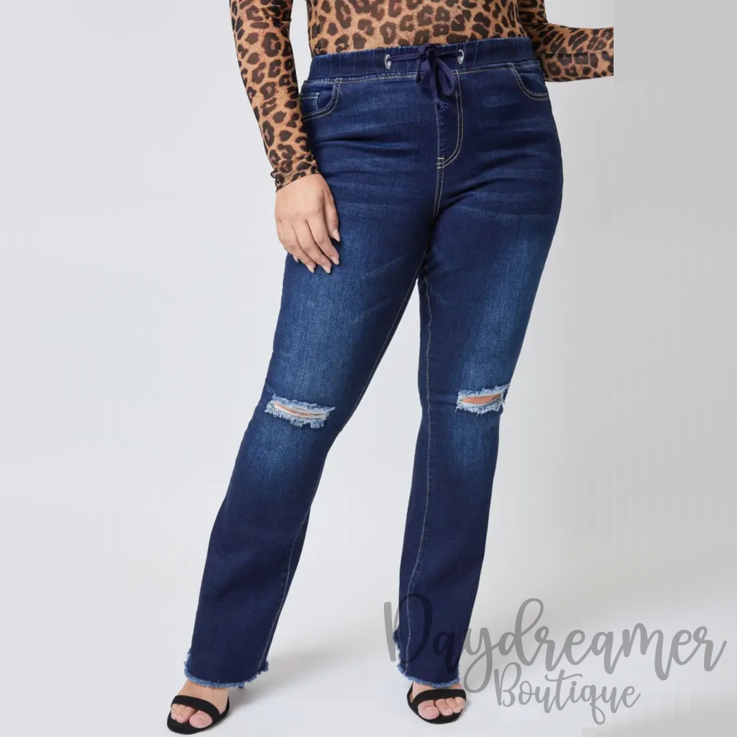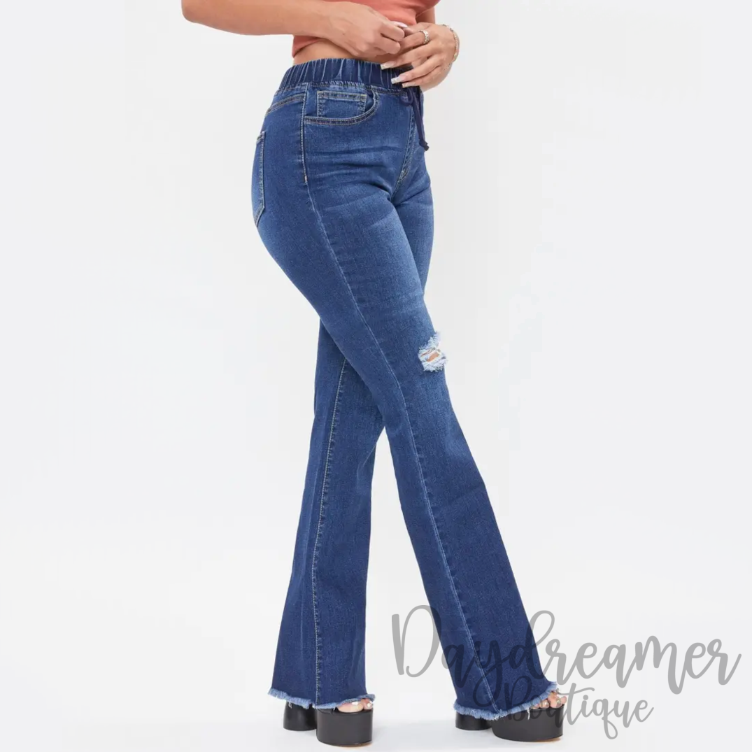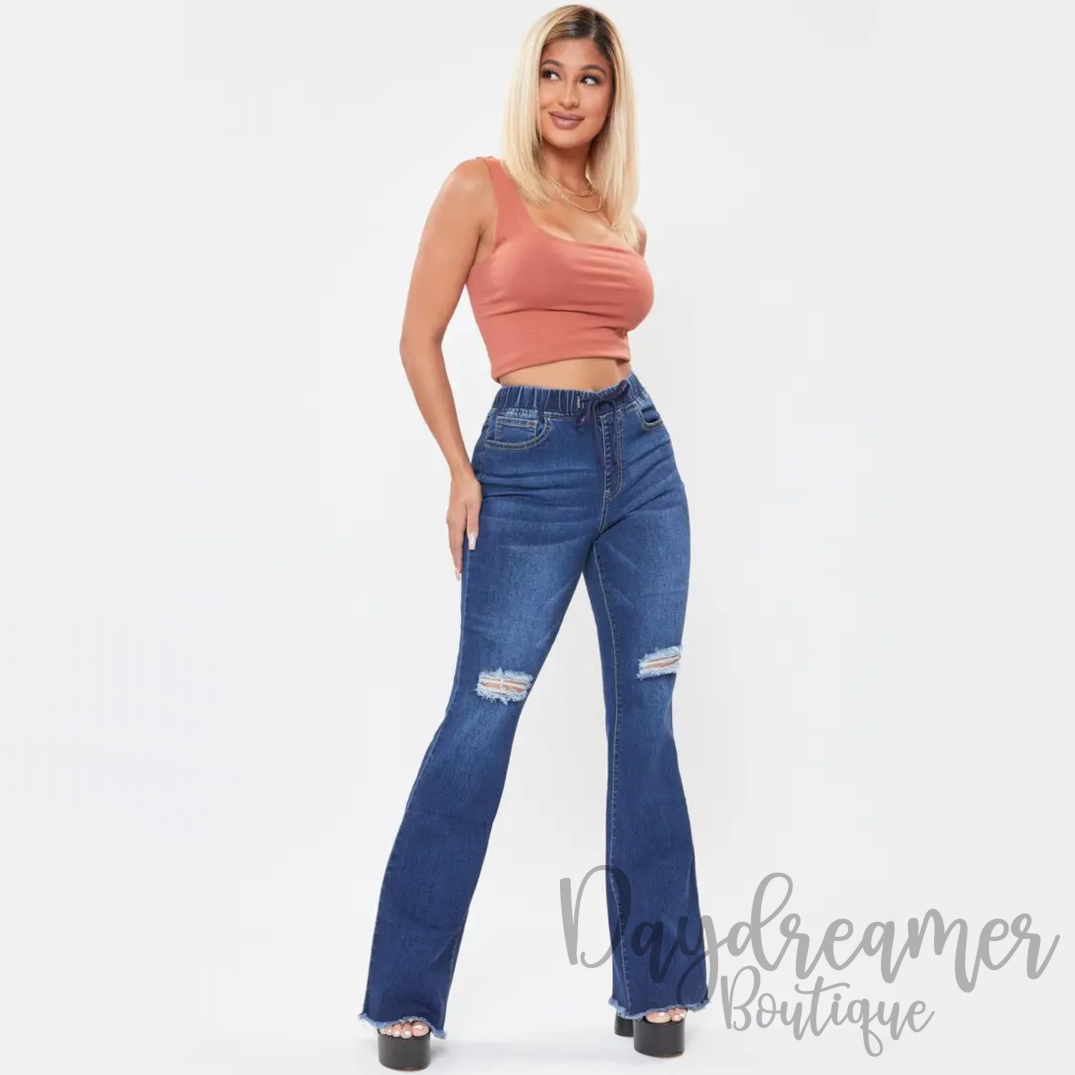 Switch up the basic denim in your wardrobe with our Dream Flares. Feel cool and look casual with this pair's perfect high-rise fit. Featuring five-pocket construction, an elastic waistband with a drawstring front tie, distressed detailing, and a frayed hem.