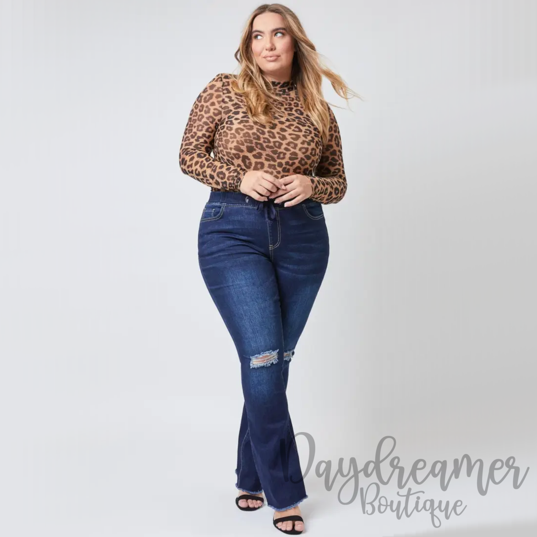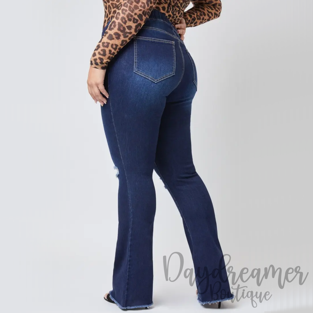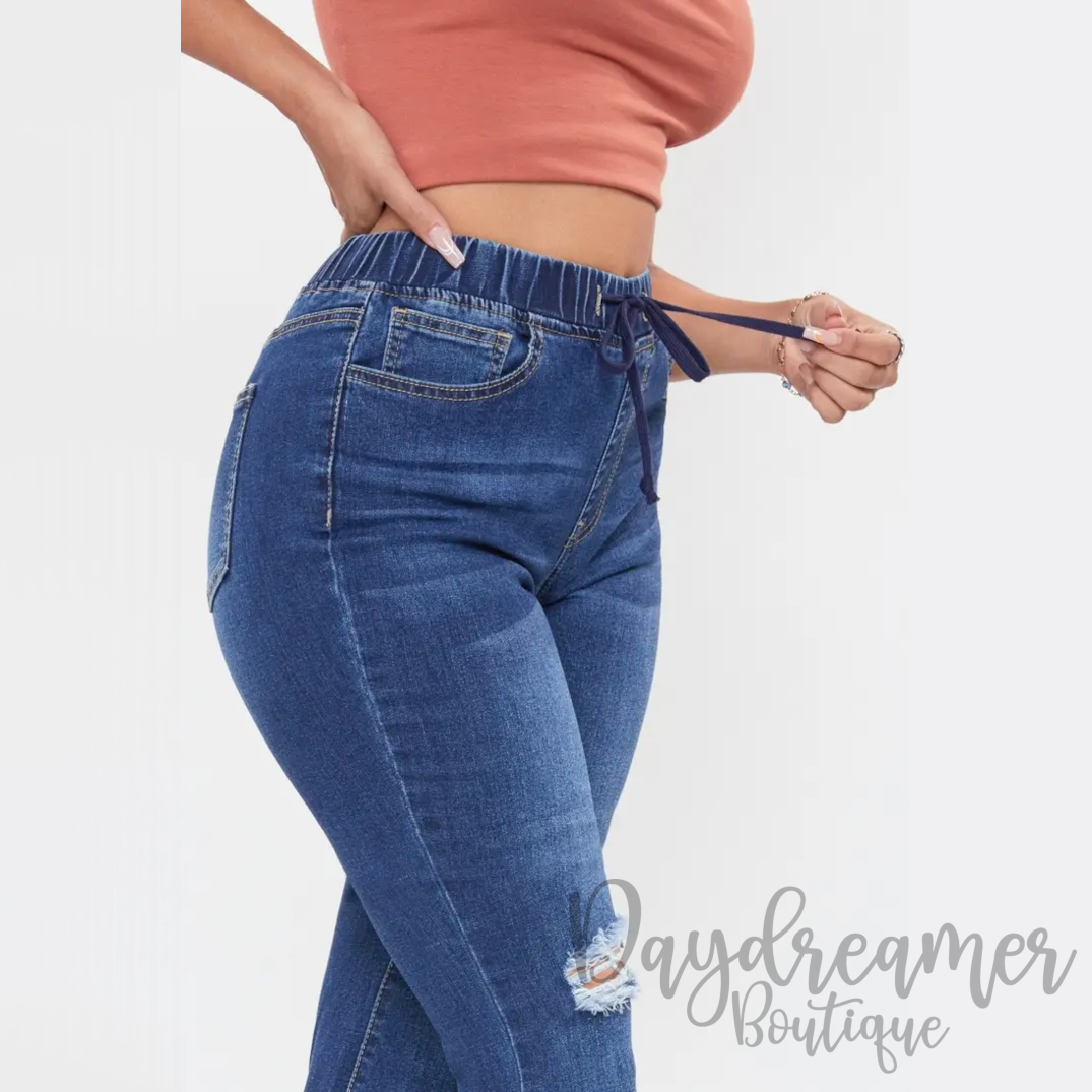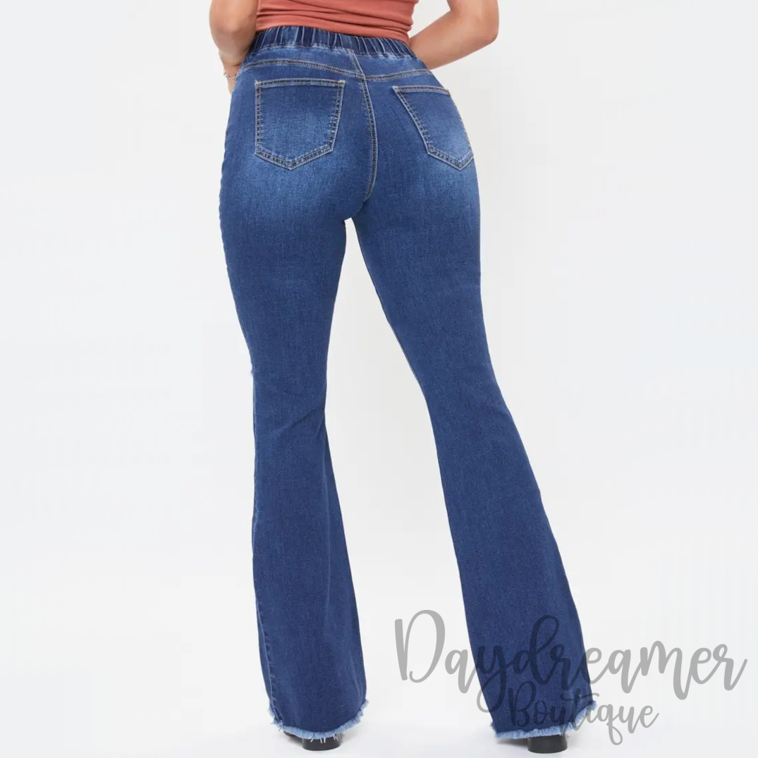 Switch up the basic denim in your wardrobe with our Dream Flares. Feel cool and look casual with this pair's perfect high-rise fit. Featuring five-pocket construction, an elastic waistband with a drawstring front tie, distressed detailing, and a frayed hem.