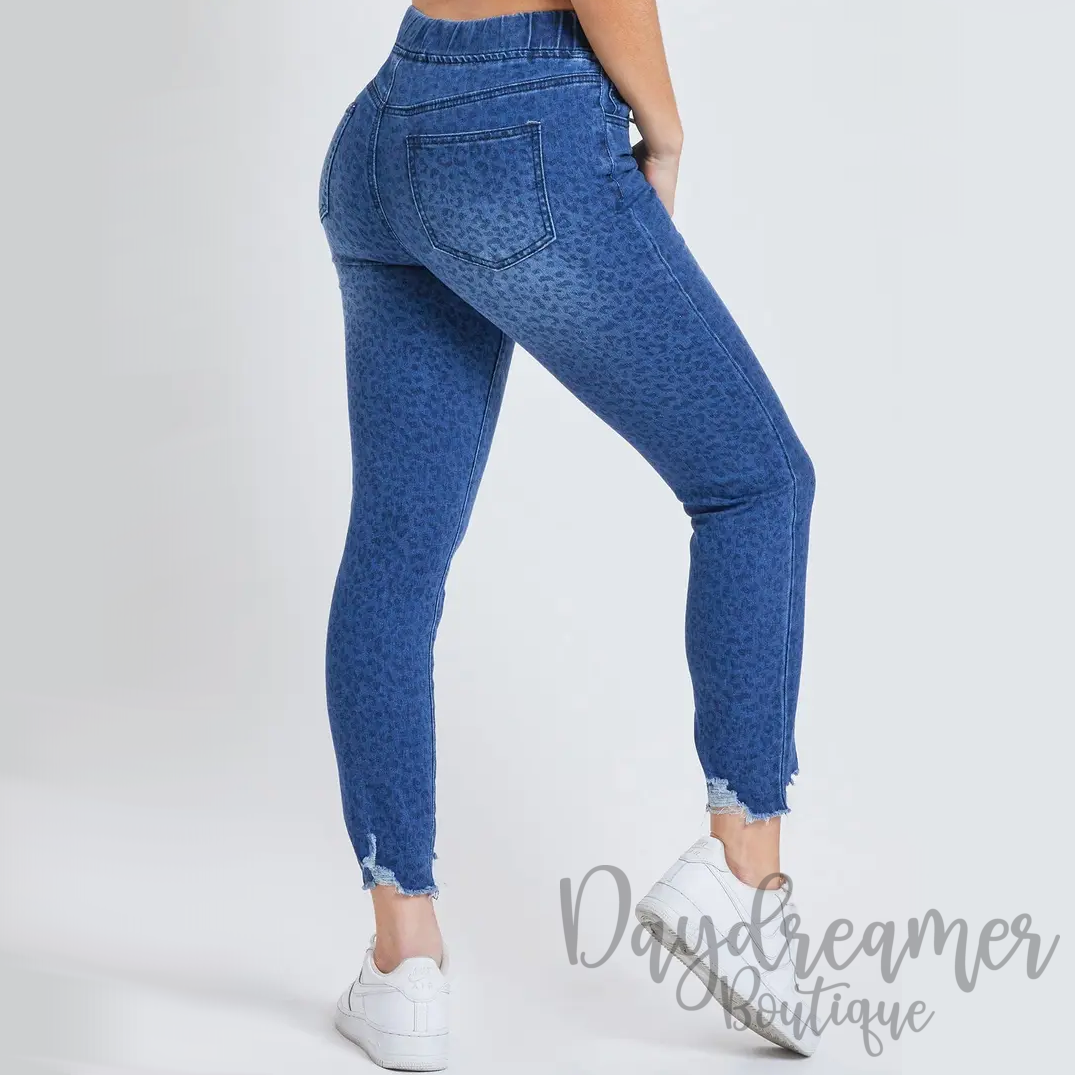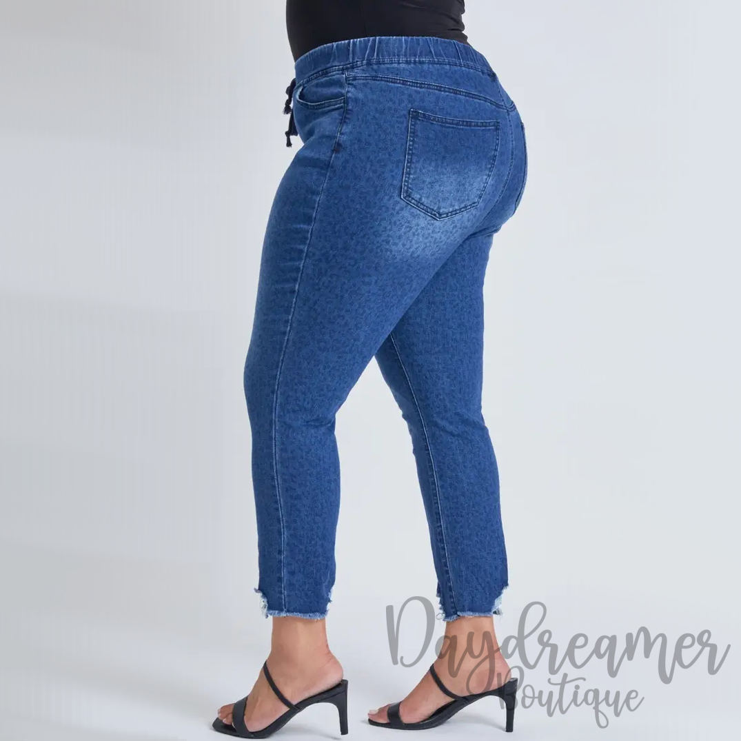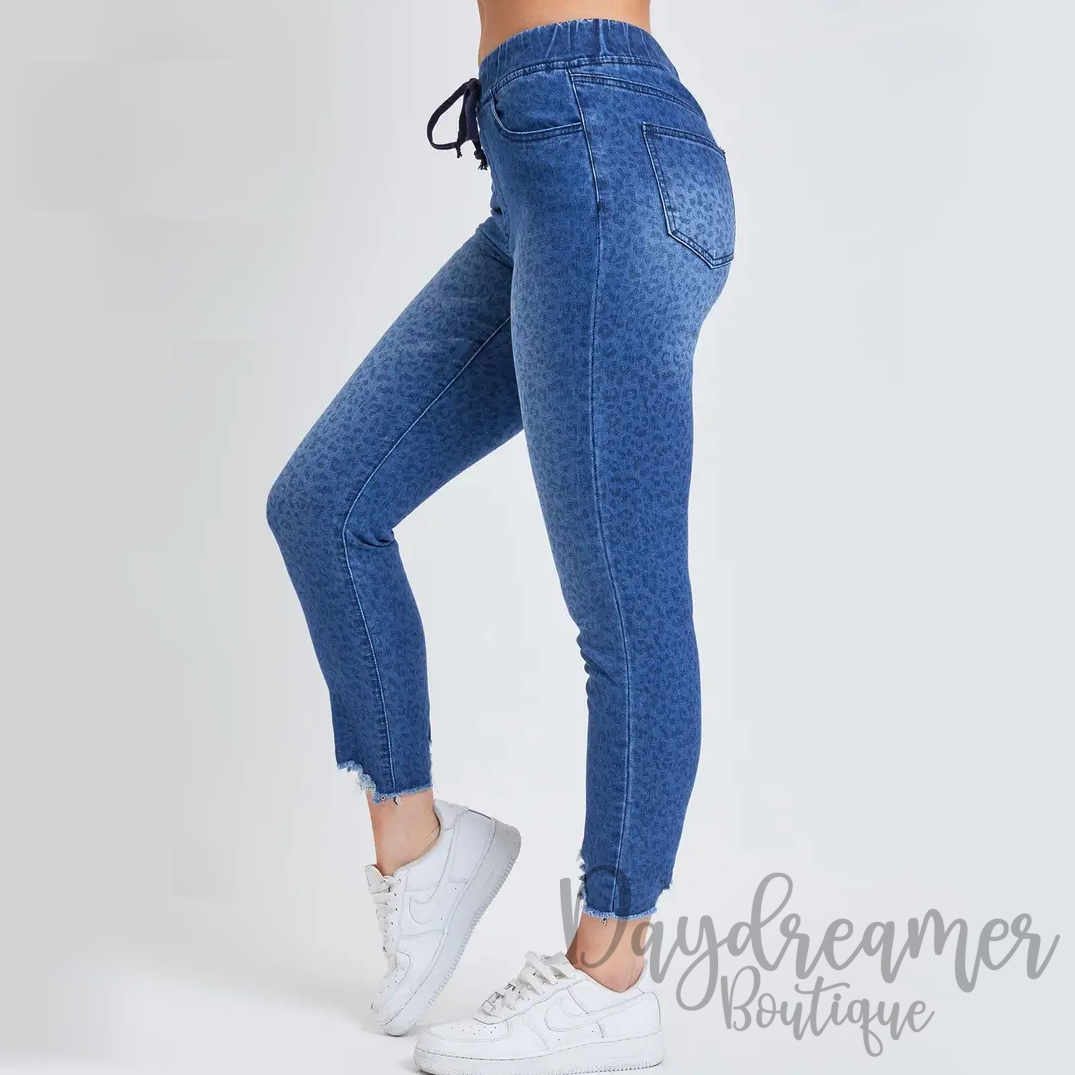 Switch up the basic denim in your wardrobe with our Dream LEOPARD Skinnies. Feel cool and look casual with this pair's perfect high-rise fit. Featuring five-pocket construction, an elastic waistband with a drawstring front tie, distressed detailing, and a frayed hem.
