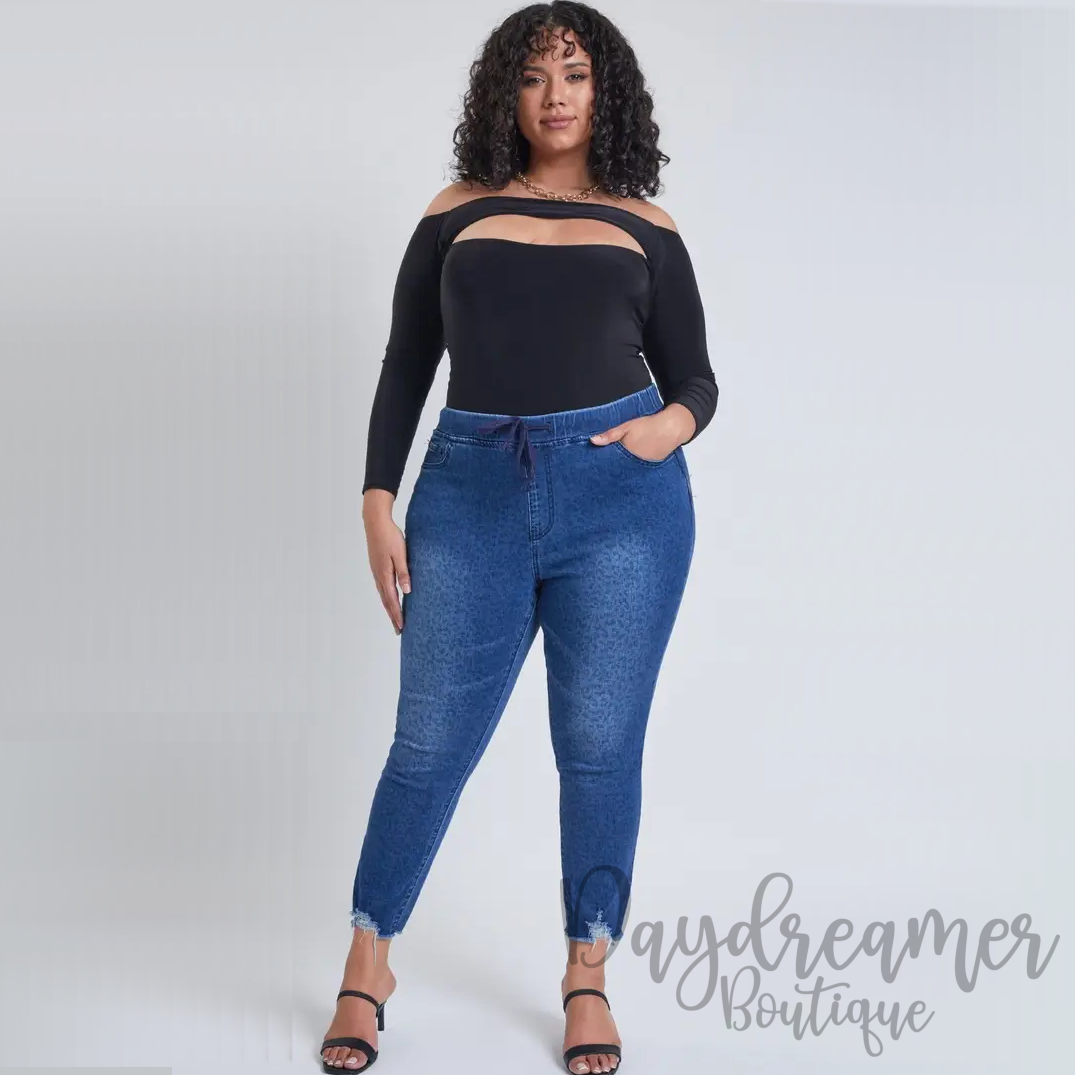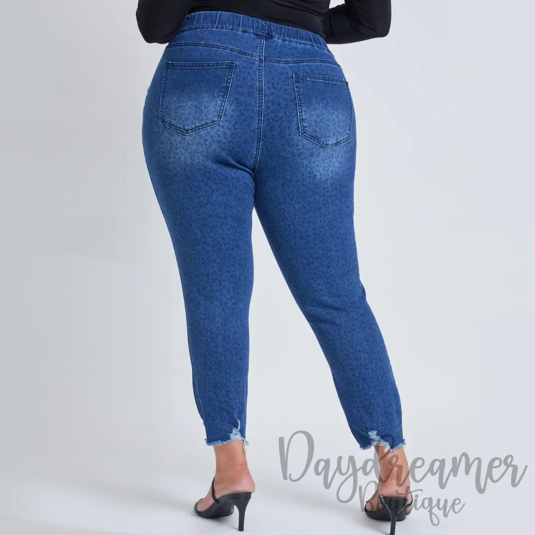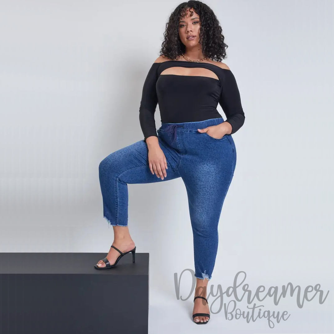 Switch up the basic denim in your wardrobe with our Dream LEOPARD Skinnies. Feel cool and look casual with this pair's perfect high-rise fit. Featuring five-pocket construction, an elastic waistband with a drawstring front tie, distressed detailing, and a frayed hem.
