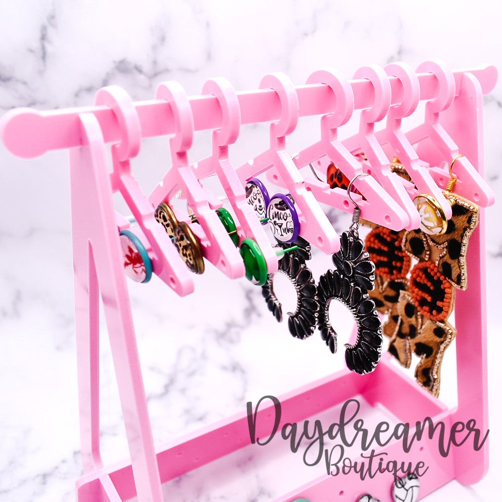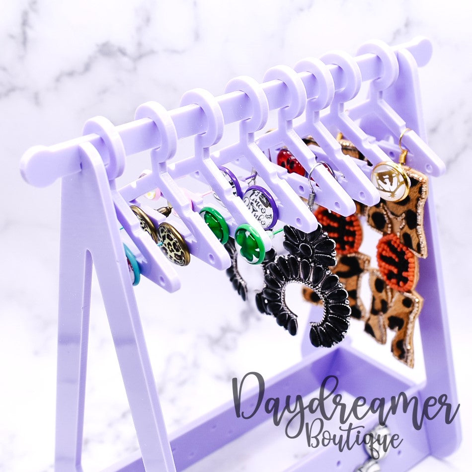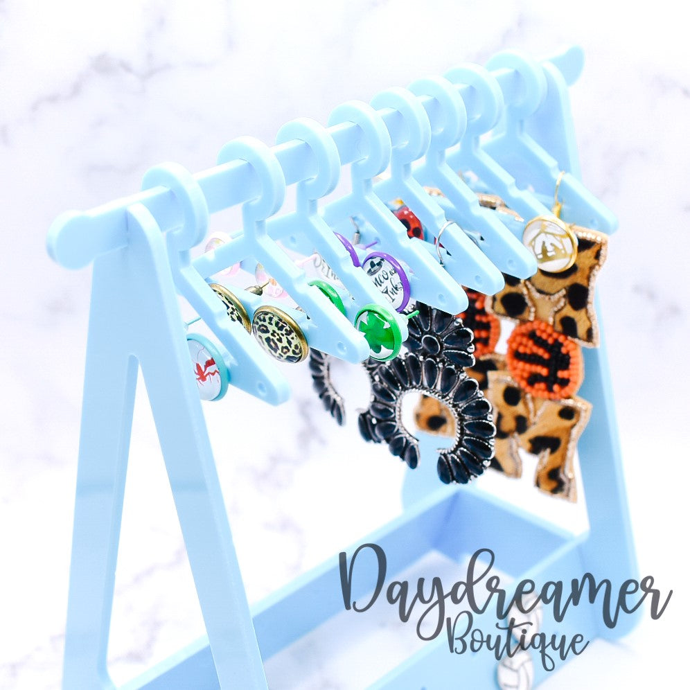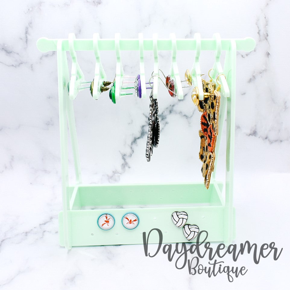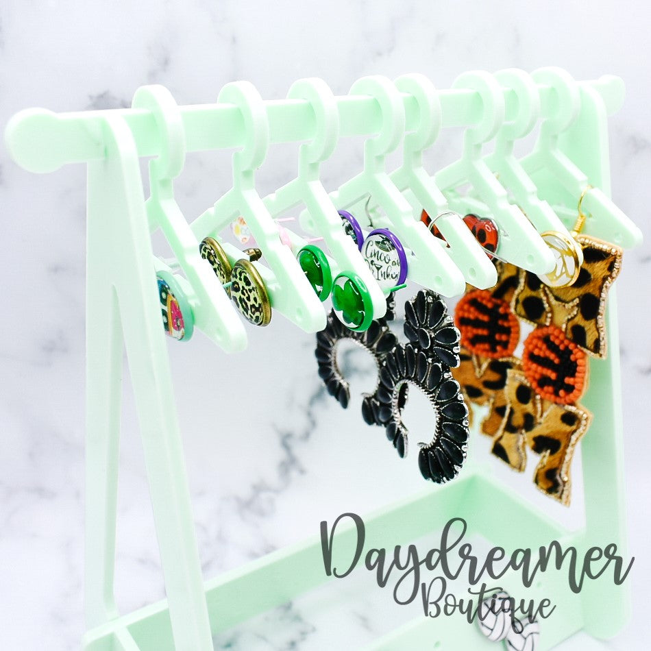 Aren't these adorable?! Each rack has 8 mini hangers that can hold up to 4 pair of earrings. Perfect for 2 studs and 2 dangles. The bases can hold up to 10 pair of studs. That's a total of at least 42 earrings! It is the cutest way to keep your earrings organized and easy to find, while also adding a decorative touch to your space.
