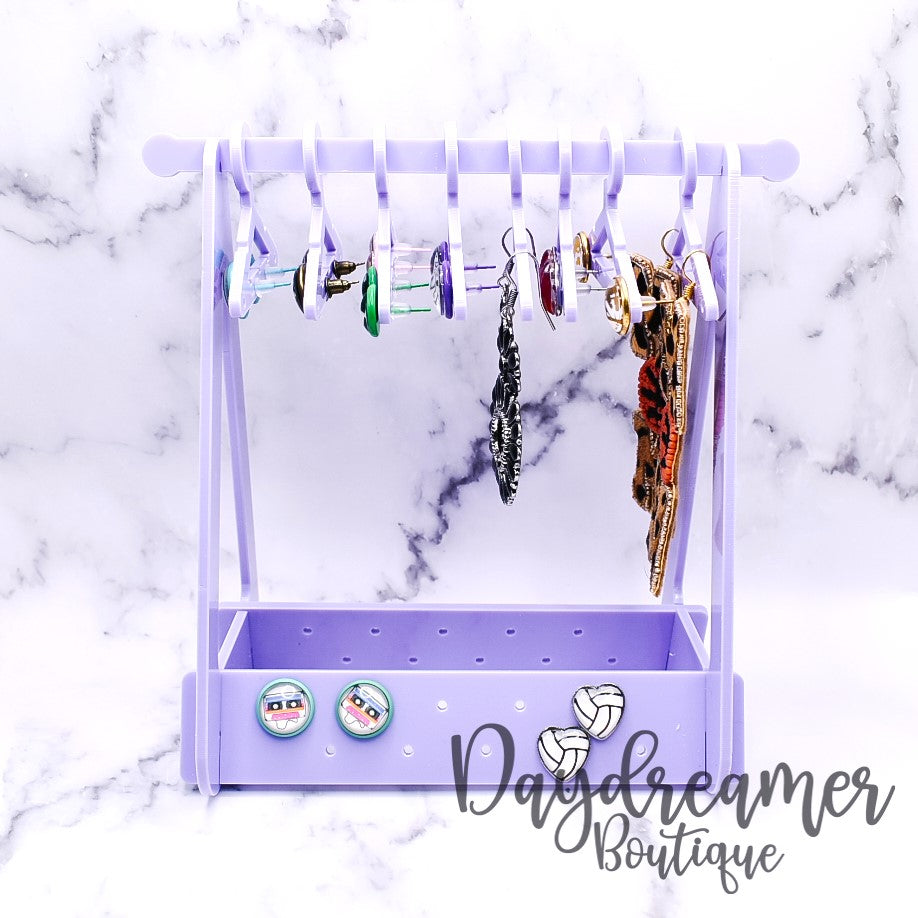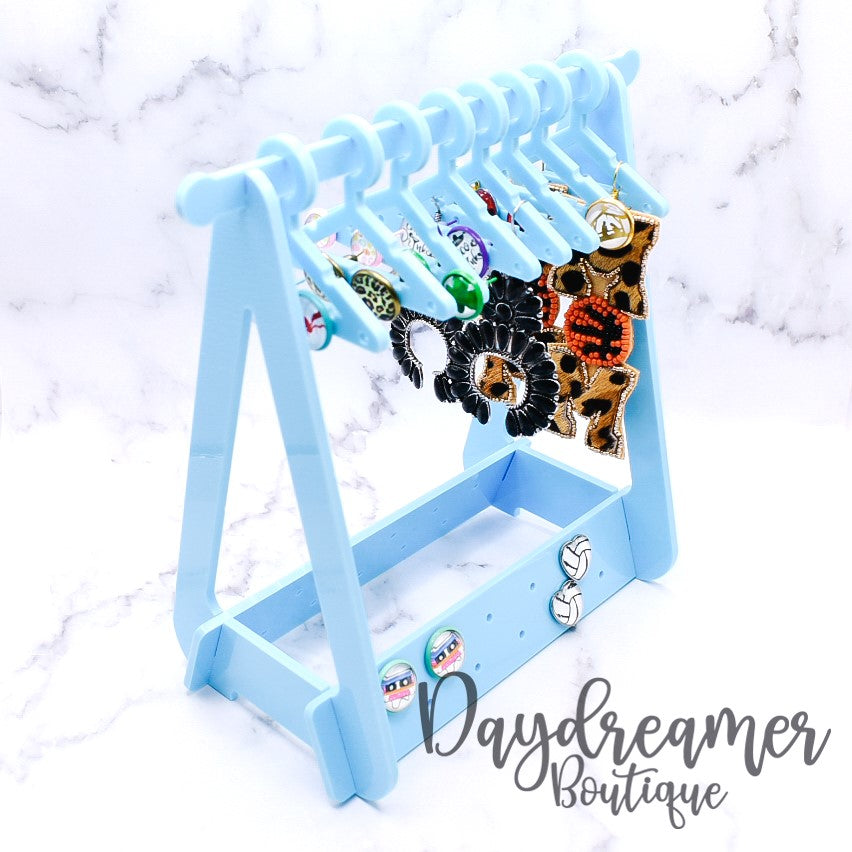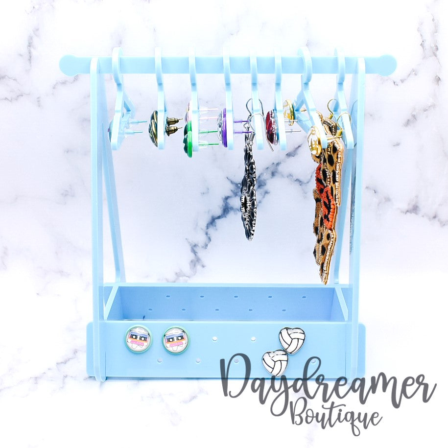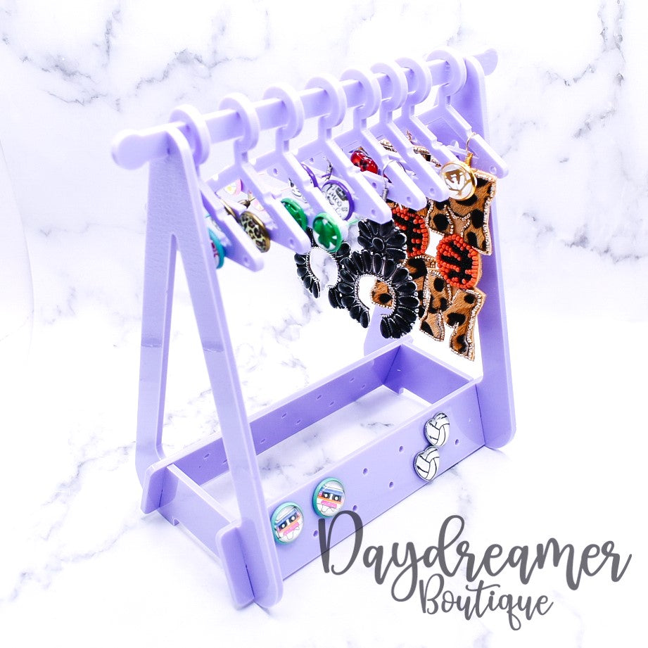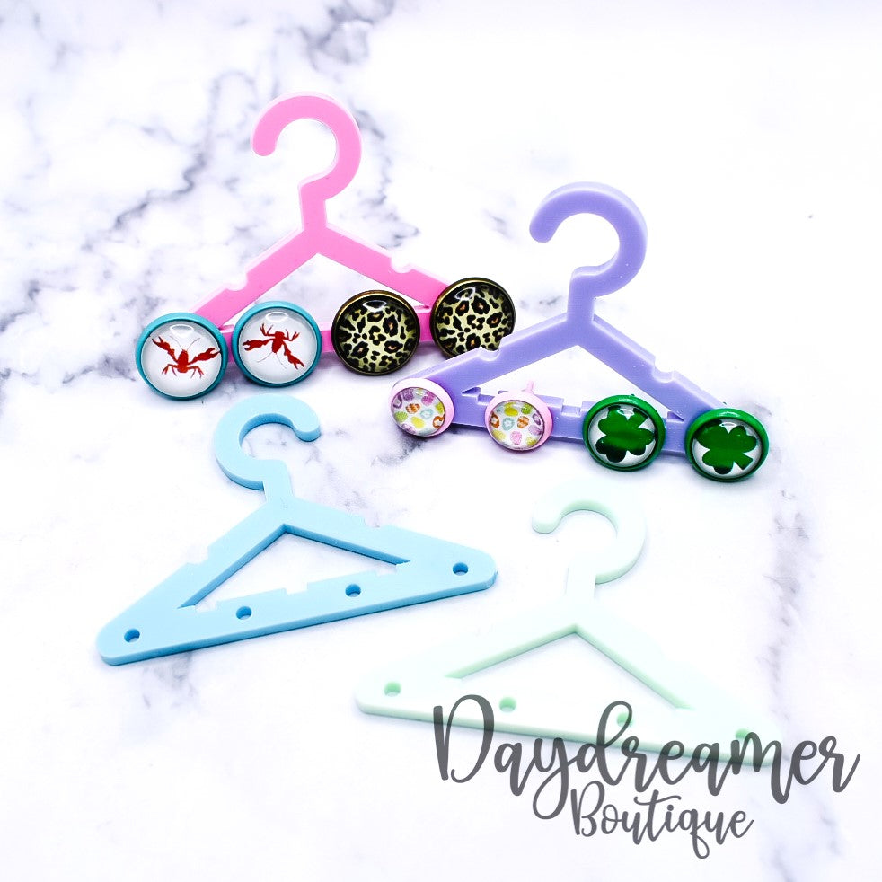 Aren't these adorable?! Each rack has 8 mini hangers that can hold up to 4 pair of earrings. Perfect for 2 studs and 2 dangles. The bases can hold up to 10 pair of studs. That's a total of at least 42 earrings! It is the cutest way to keep your earrings organized and easy to find, while also adding a decorative touch to your space.