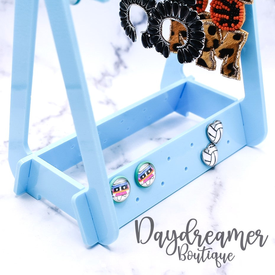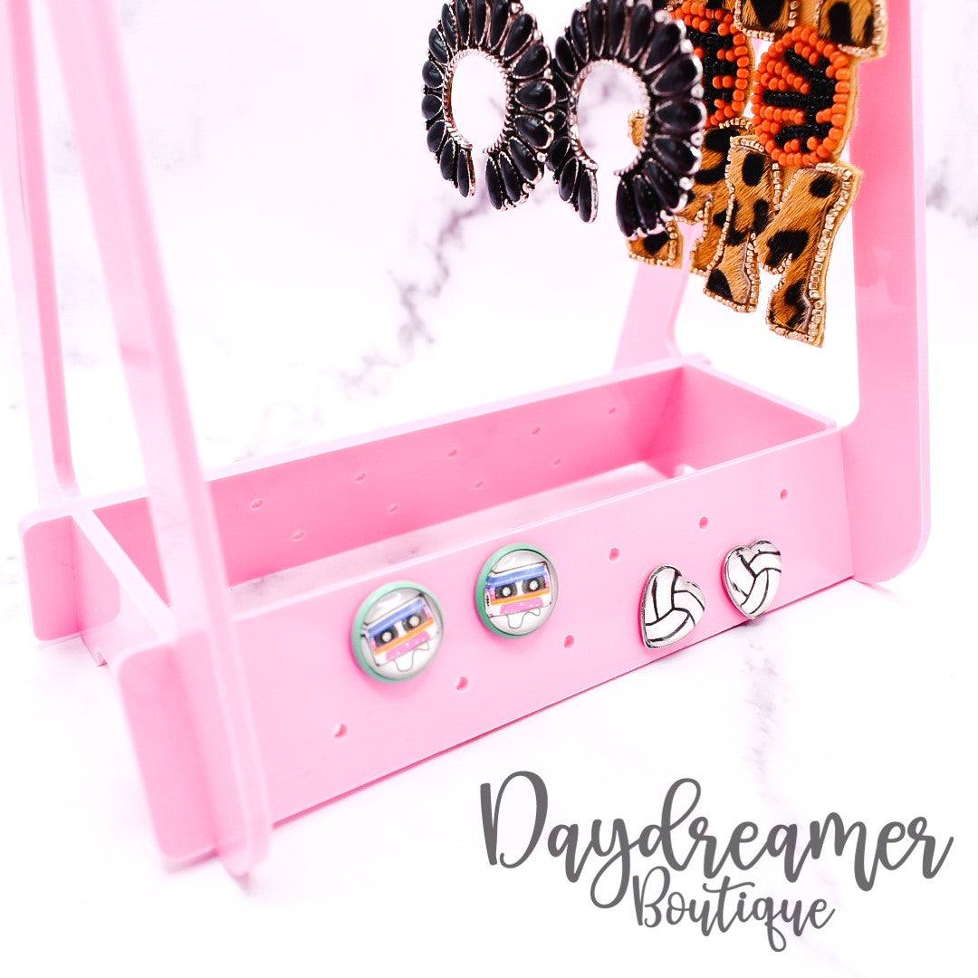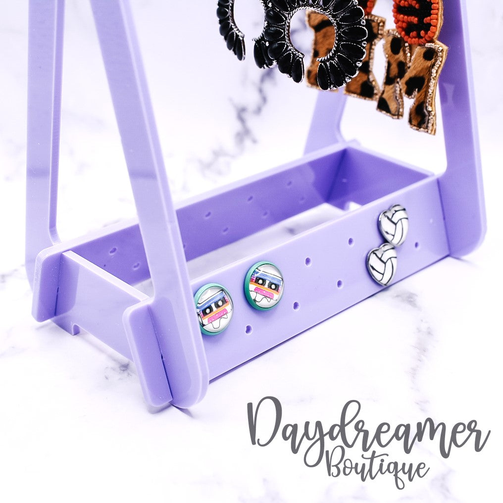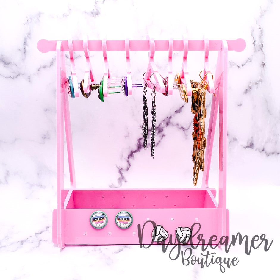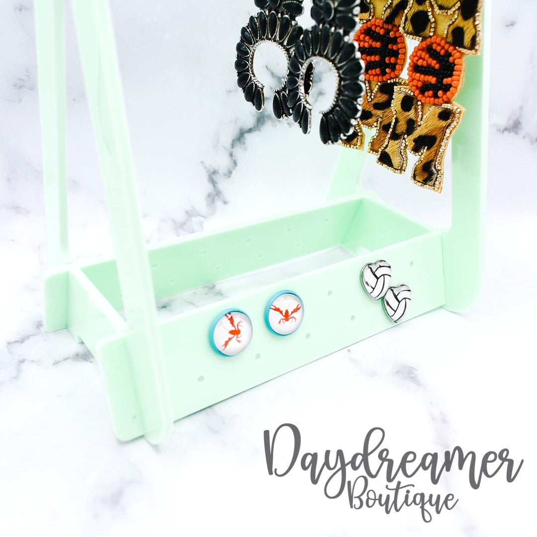 Aren't these adorable?! Each rack has 8 mini hangers that can hold up to 4 pair of earrings. Perfect for 2 studs and 2 dangles. The bases can hold up to 10 pair of studs. That's a total of at least 42 earrings! It is the cutest way to keep your earrings organized and easy to find, while also adding a decorative touch to your space.
