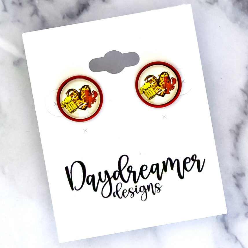 Shown are 12mm stud earrings. This is our most popular size for both adults and kids!