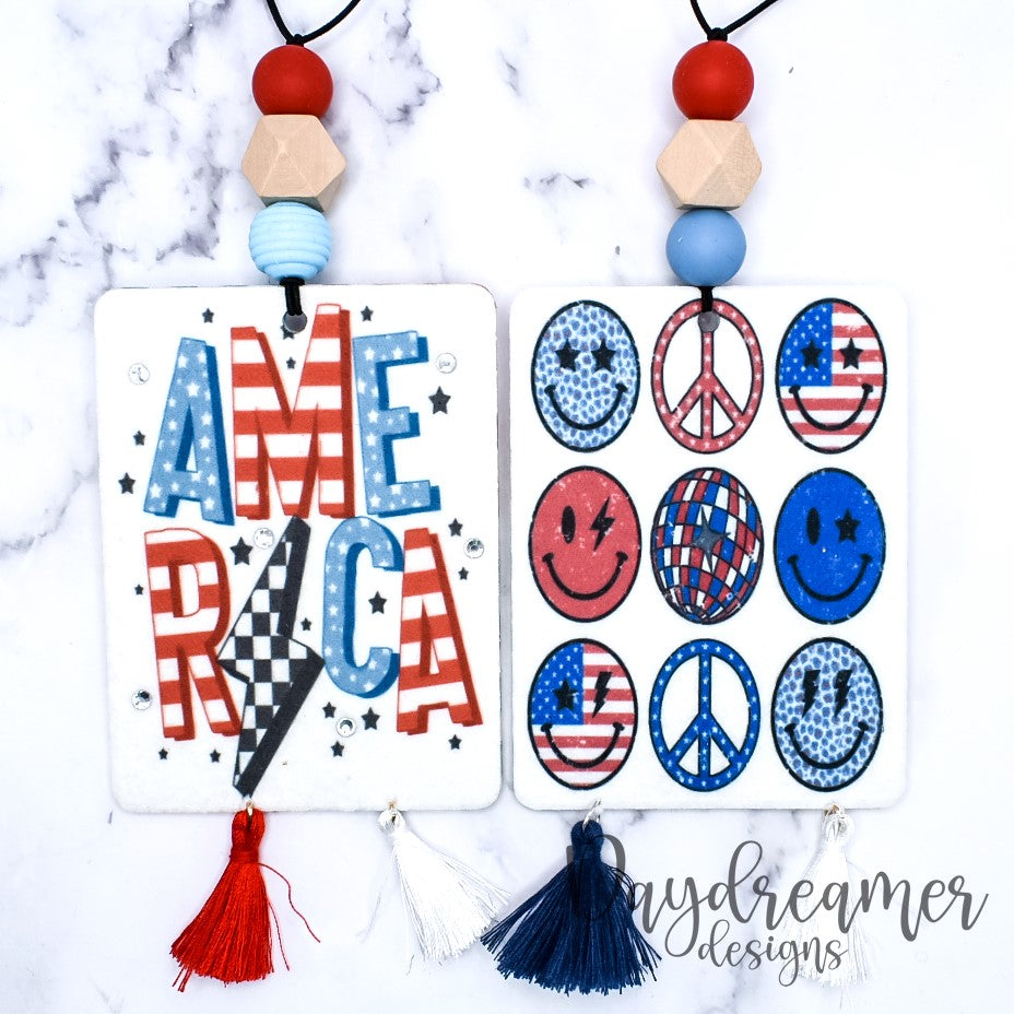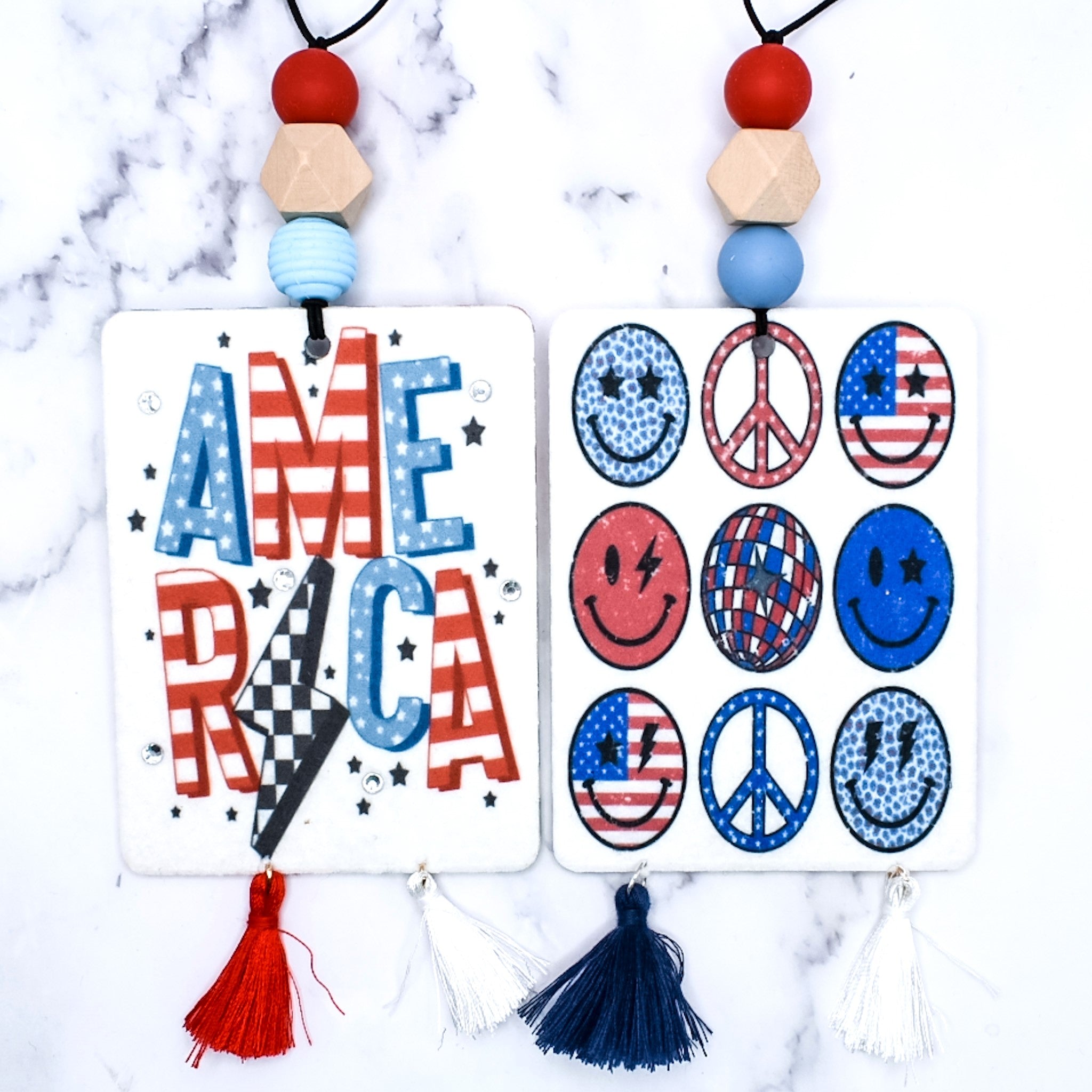 Our felt freshies are full of detail with a 2 sided print and an option for beads and tassels. Hang them in your car, office, or any small space. Once they fade, you can re-scent them with your favorite perfume, essential oil, etc. by applying them to the sides and allowing the oil/liquid to soak in. Bead, tassel, and string color may vary.