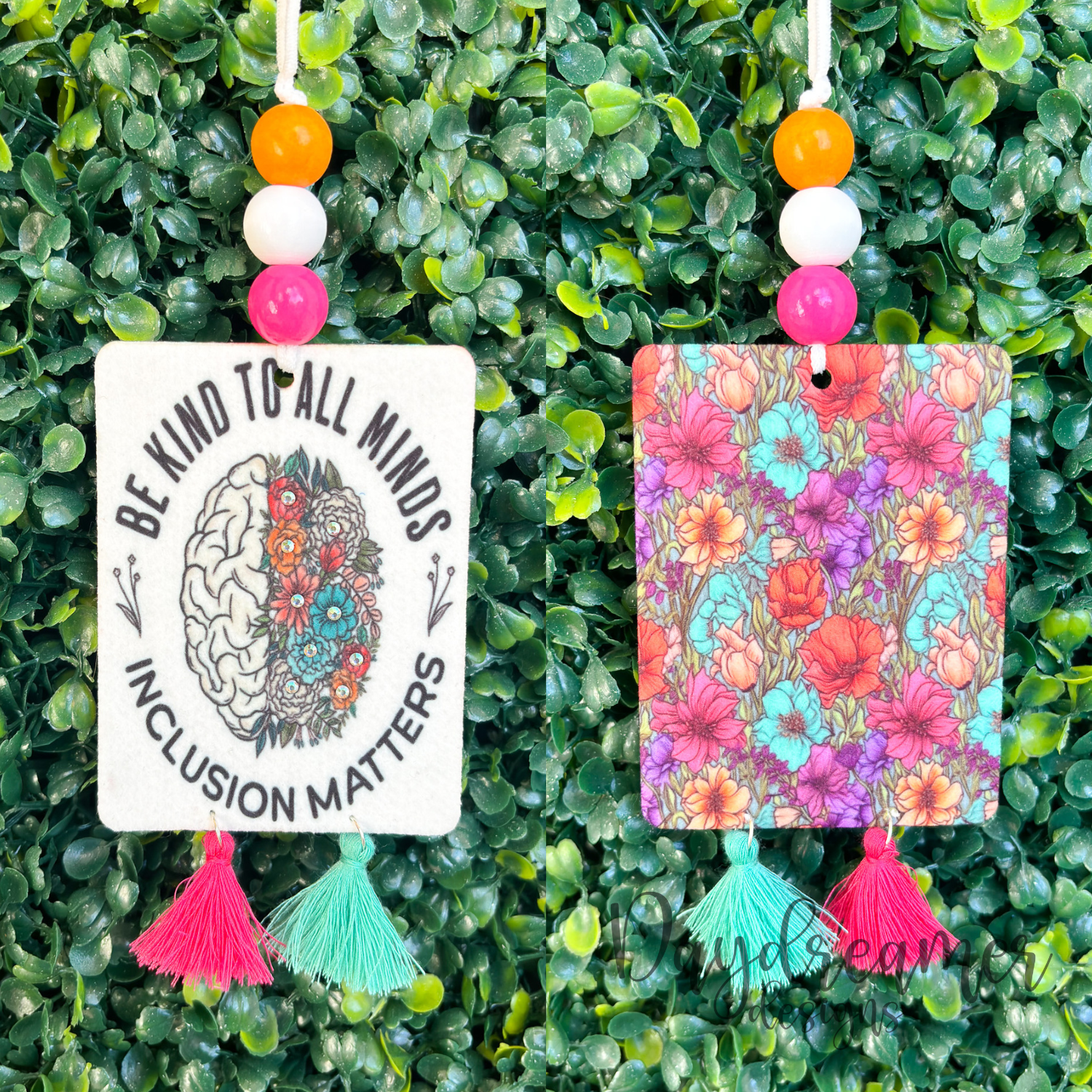 Our felt freshies are full of detail with a 2 sided print and an option for beads and tassels. Hang them in your car, office, or any small space. Once they fade, you can re-scent them with your favorite perfume, essential oil, etc. by applying them to the sides and allowing the oil/liquid to soak in. Bead, tassel, and string color may vary.