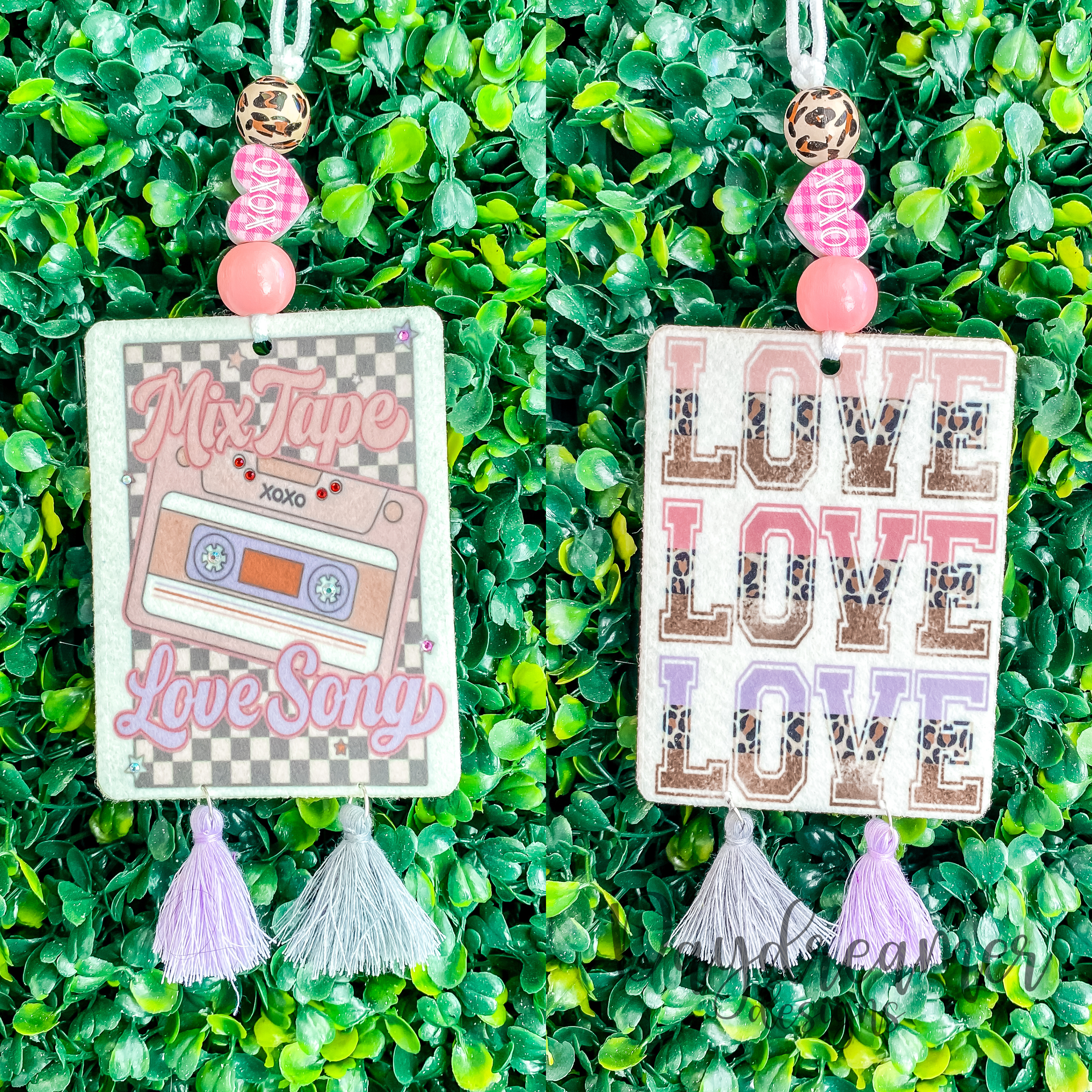 Our felt freshies are full of detail with a 2 sided print and an option for beads and tassels. Hang them in your car, office, or any small space. Once they fade, you can re-scent them with your favorite perfume, essential oil, etc. by applying them to the sides and allowing the oil/liquid to soak in. Bead, tassel, and string color may vary.