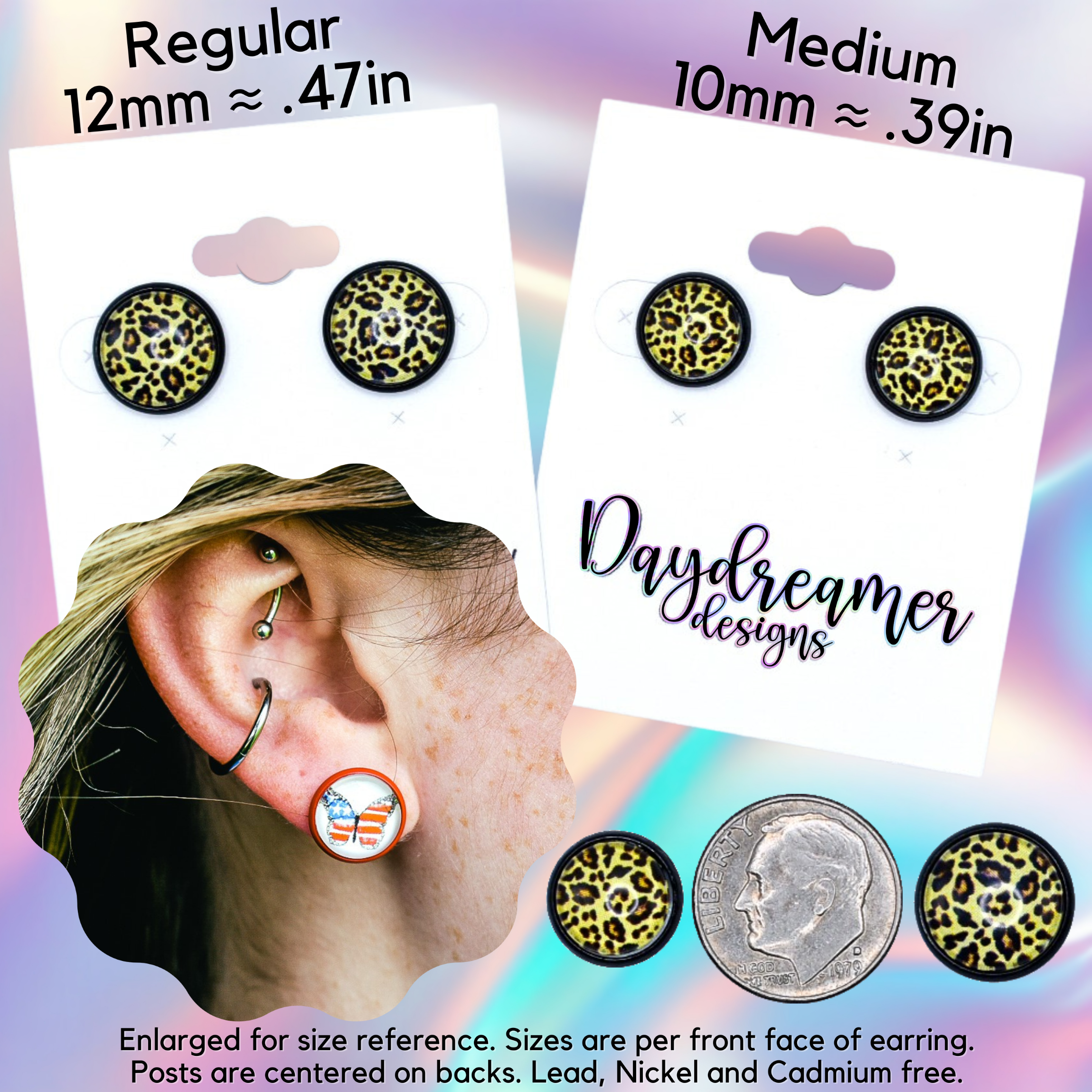 Shown are 12mm stud earrings. This is our most popular size for both adults and kids!
