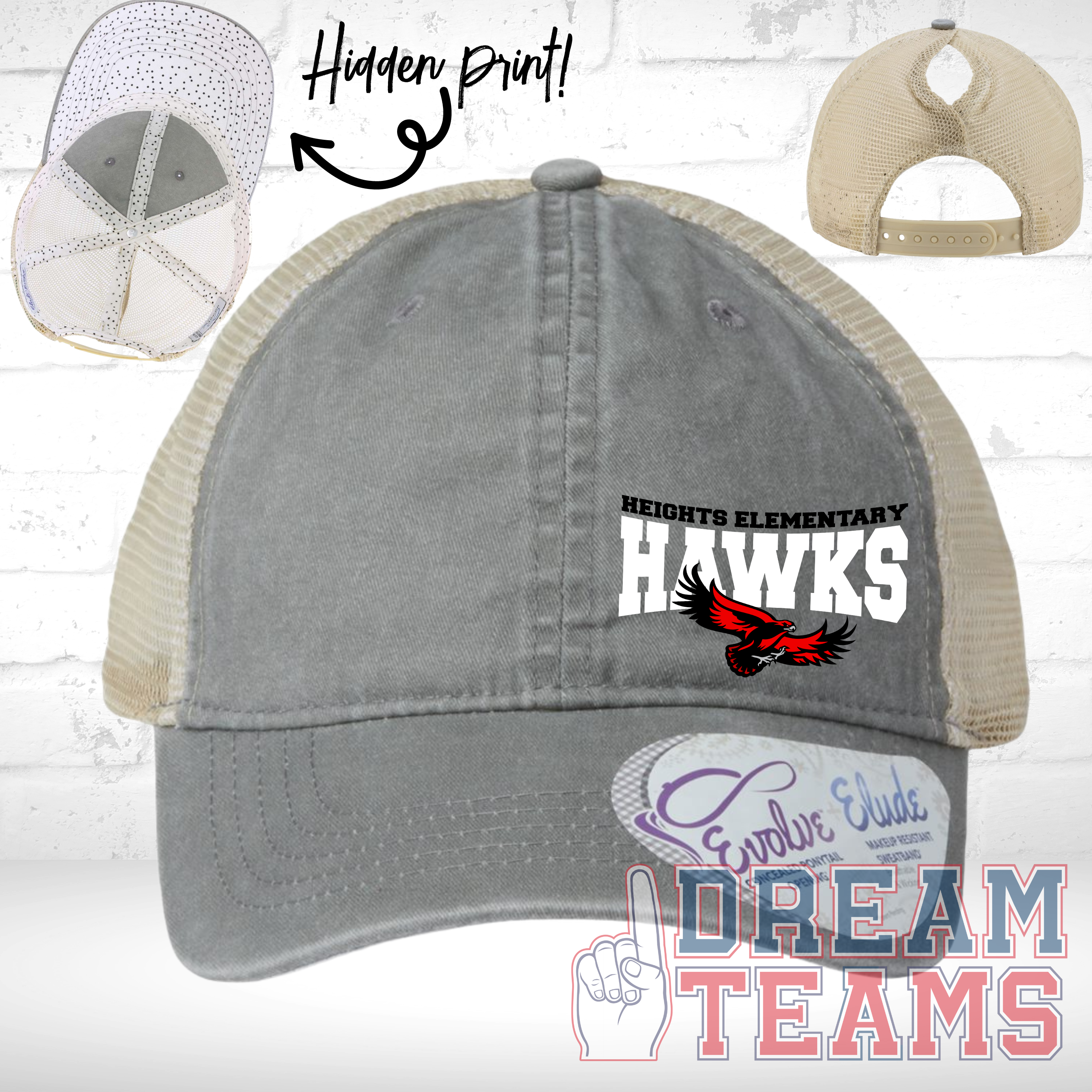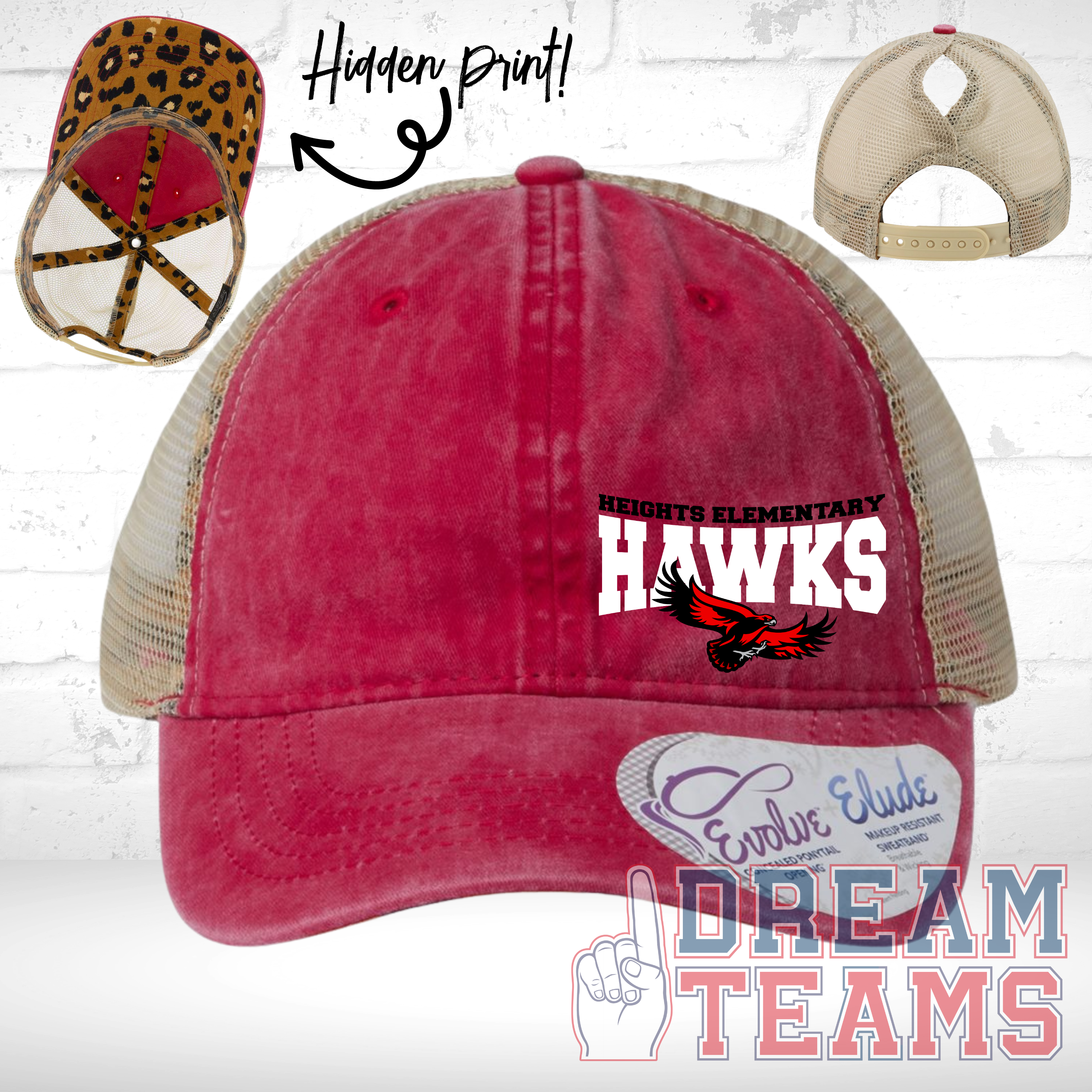 Stay focused on the game and keep the sun out of your face. Made with a classic six-panel design, this hat features a polyester front and a mesh back for enhanced ventilation, keeping you cool and comfortable in the sun. The adjustable snapback closure ensures a secure fit, while the pre-curved visor adds a touch of sporty flair. This design also features a concealed ponytail opening and an adorable printed underside!