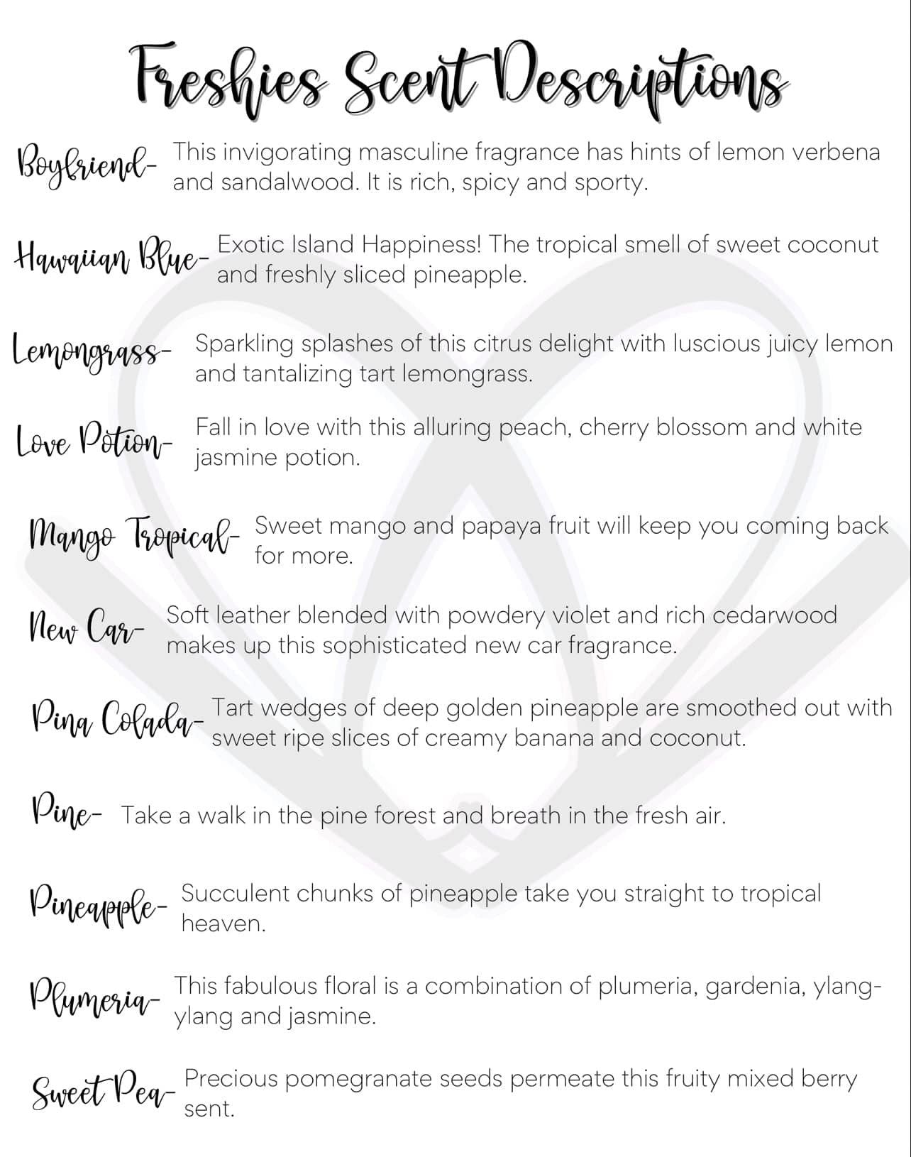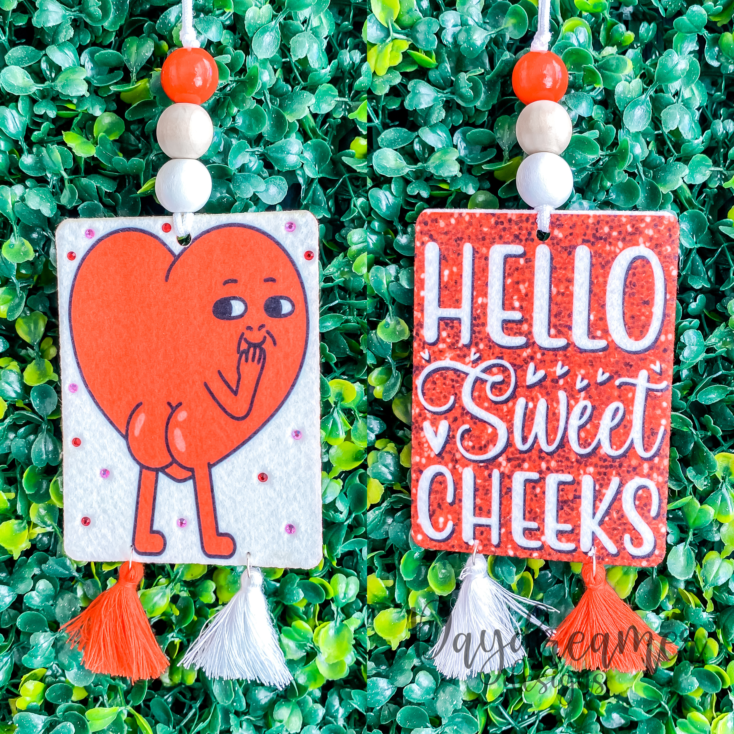 Our felt freshies are full of detail with a 2 sided print and an option for beads and tassels. Hang them in your car, office, or any small space. Once they fade, you can re-scent them with your favorite perfume, essential oil, etc. by applying them to the sides and allowing the oil/liquid to soak in. Bead, tassel, and string color may vary.