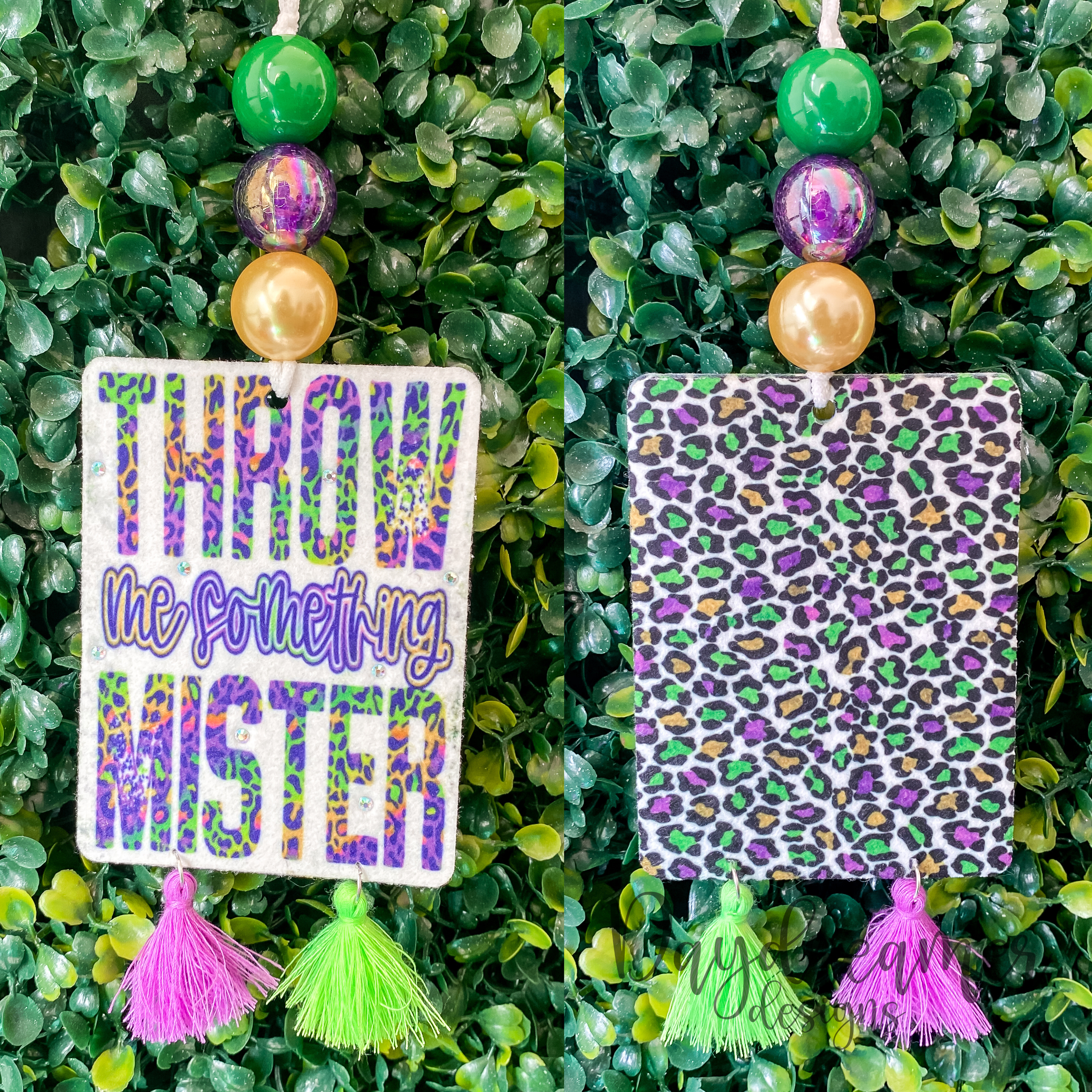 Our felt freshies are full of detail with a 2 sided print and an option for beads and tassels. Hang them in your car, office, or any small space. Once they fade, you can re-scent them with your favorite perfume, essential oil, etc. by applying them to the sides and allowing the oil/liquid to soak in. Bead, tassel, and string color may vary.