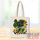 Made from 100% natural cotton canvas. 23" handles with a 10.5" drop. The print is one-sided. Measurements: 15"W x 16"H