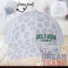 Hat brands and color shades may vary depending on availability. This hat is Unisex-sized and features a mesh back with a ponytail opening. An adjustable closure ensures a secure fit.