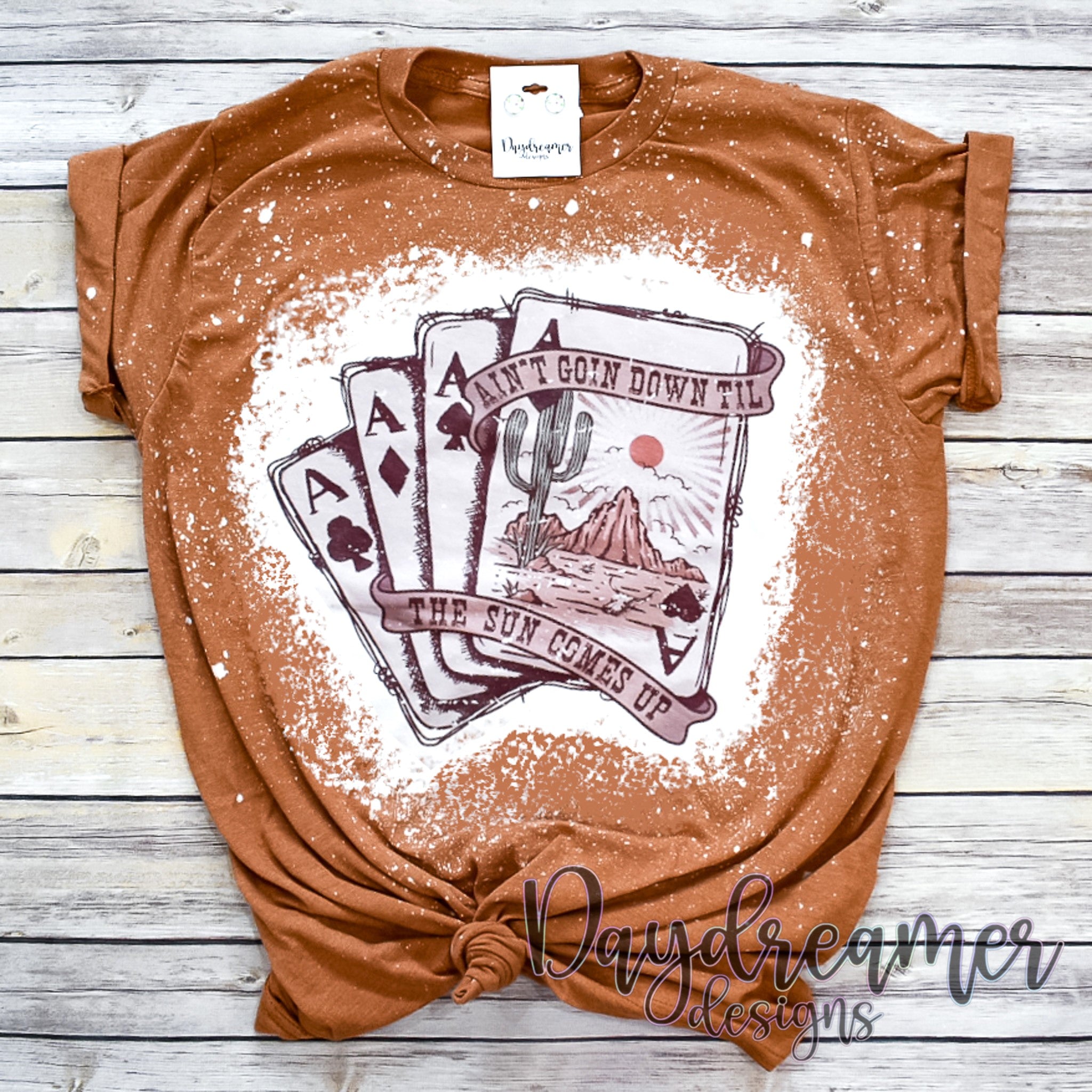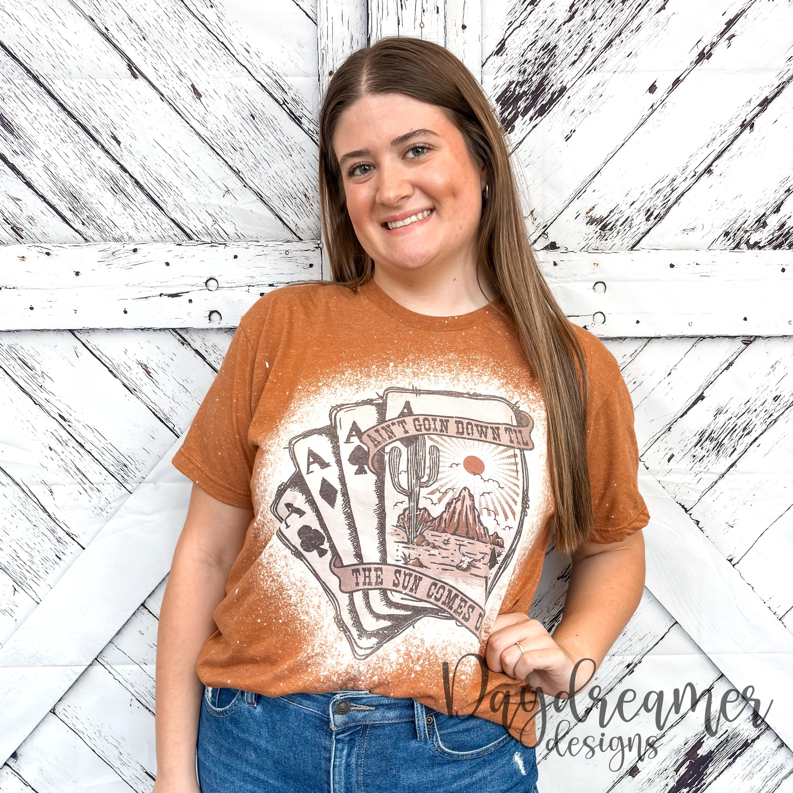 *Bleached tees are weather-dependent. We take advantage of every sunny minute! However, please note that rainy/cold/windy/overcast weather may delay production or produce more of a vintage look. Bleaching is a process of destressing and discoloring the tees, so no two will be the same. Bleached tees are washed before shipment.