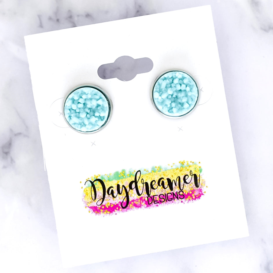 Shown are 12mm stud earrings. This is our most popular size for both adults and kids!