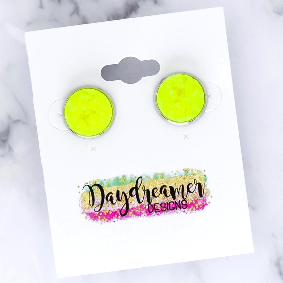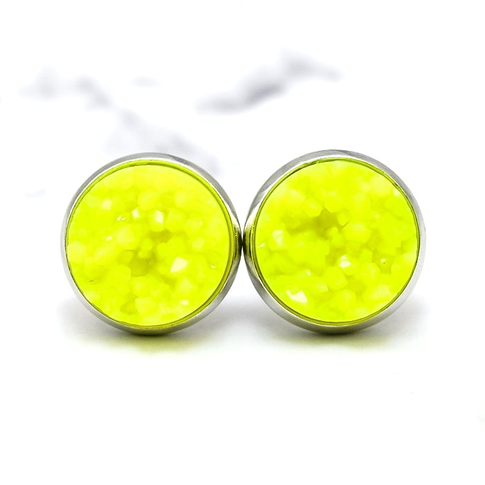 Shown are 12mm stud earrings. This is our most popular size for both adults and kids!