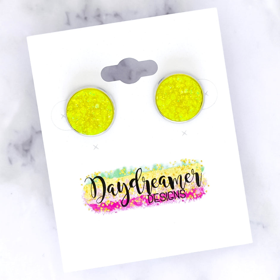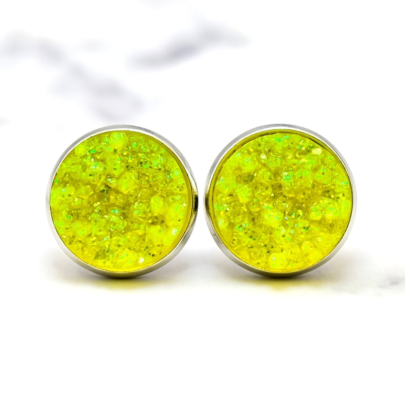 Neon Yellow Glitter Druzy Stud Earrings