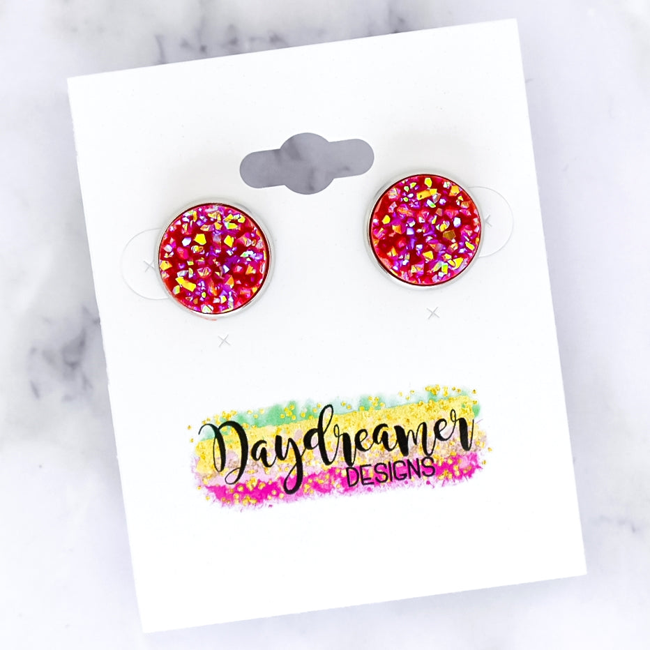 Shown are 12mm stud earrings. This is our most popular size for both adults and kids!