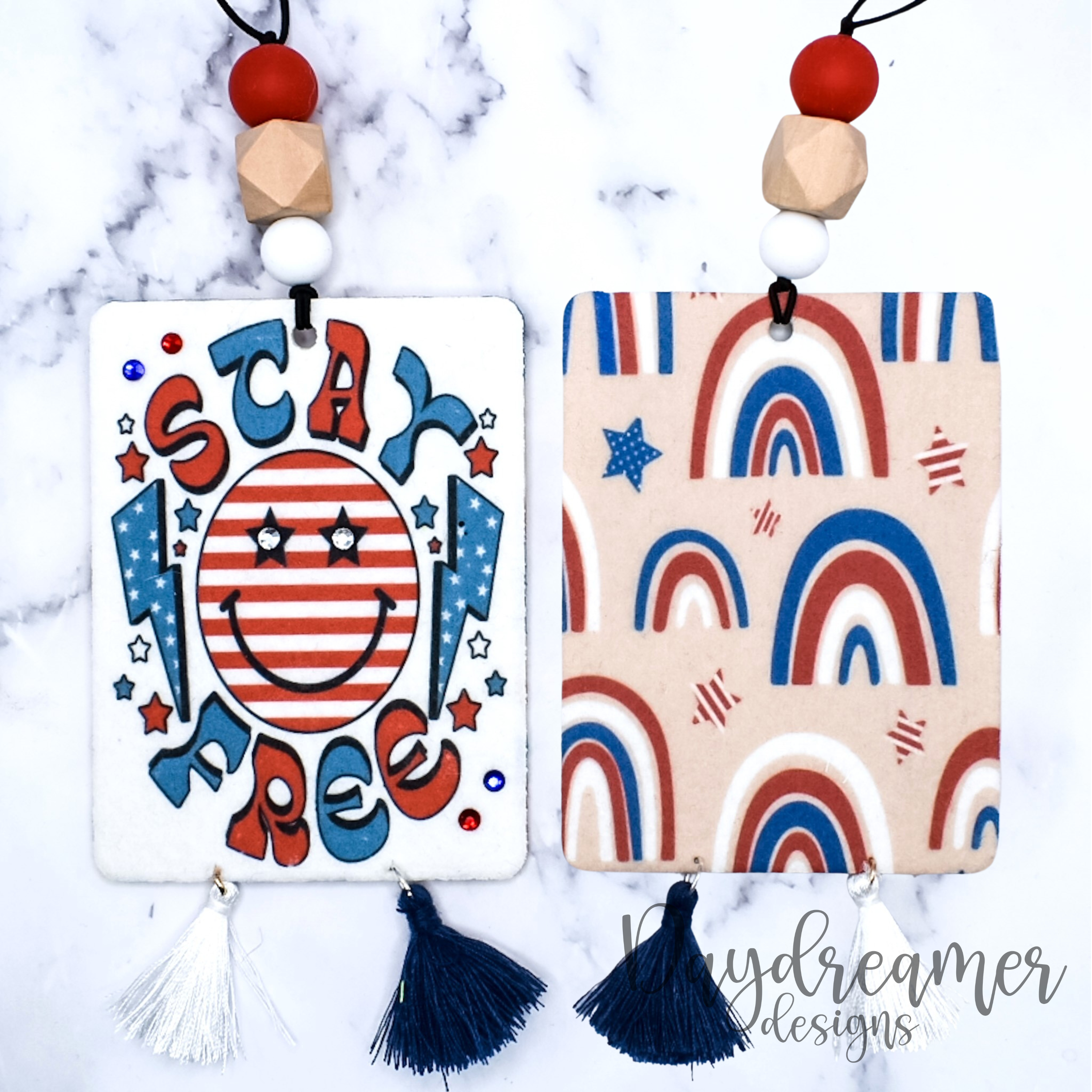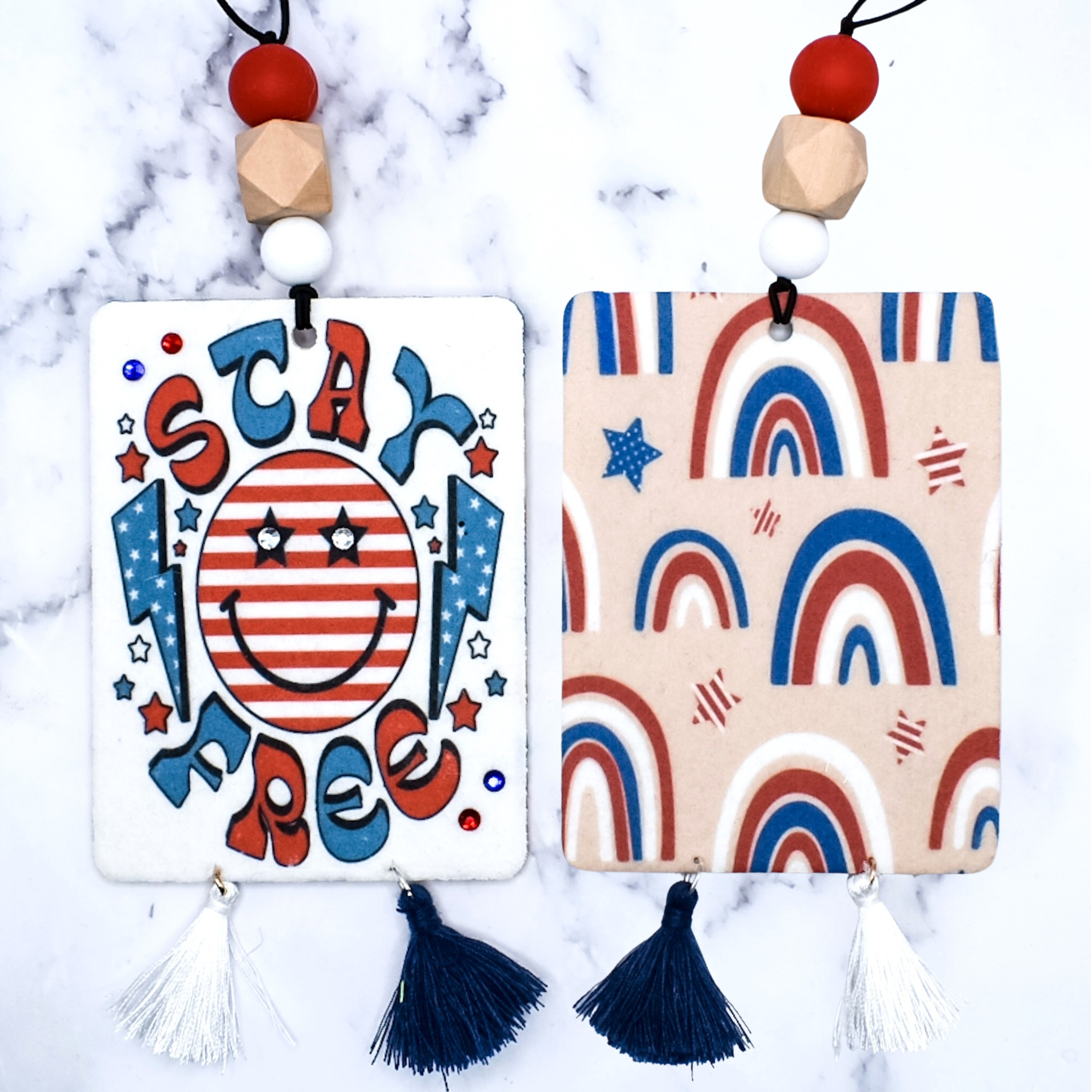 Our felt freshies are full of detail with a 2 sided print and an option for beads and tassels. Hang them in your car, office, or any small space. Once they fade, you can re-scent them with your favorite perfume, essential oil, etc. by applying them to the sides and allowing the oil/liquid to soak in. Bead, tassel, and string color may vary.