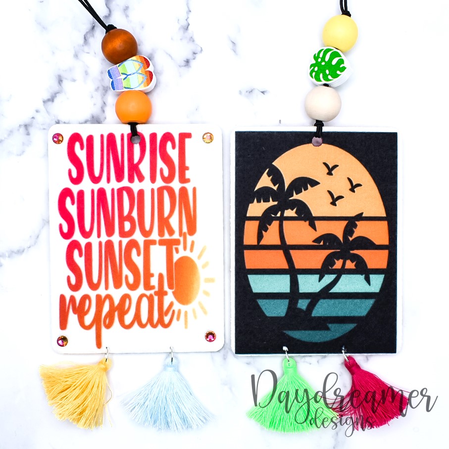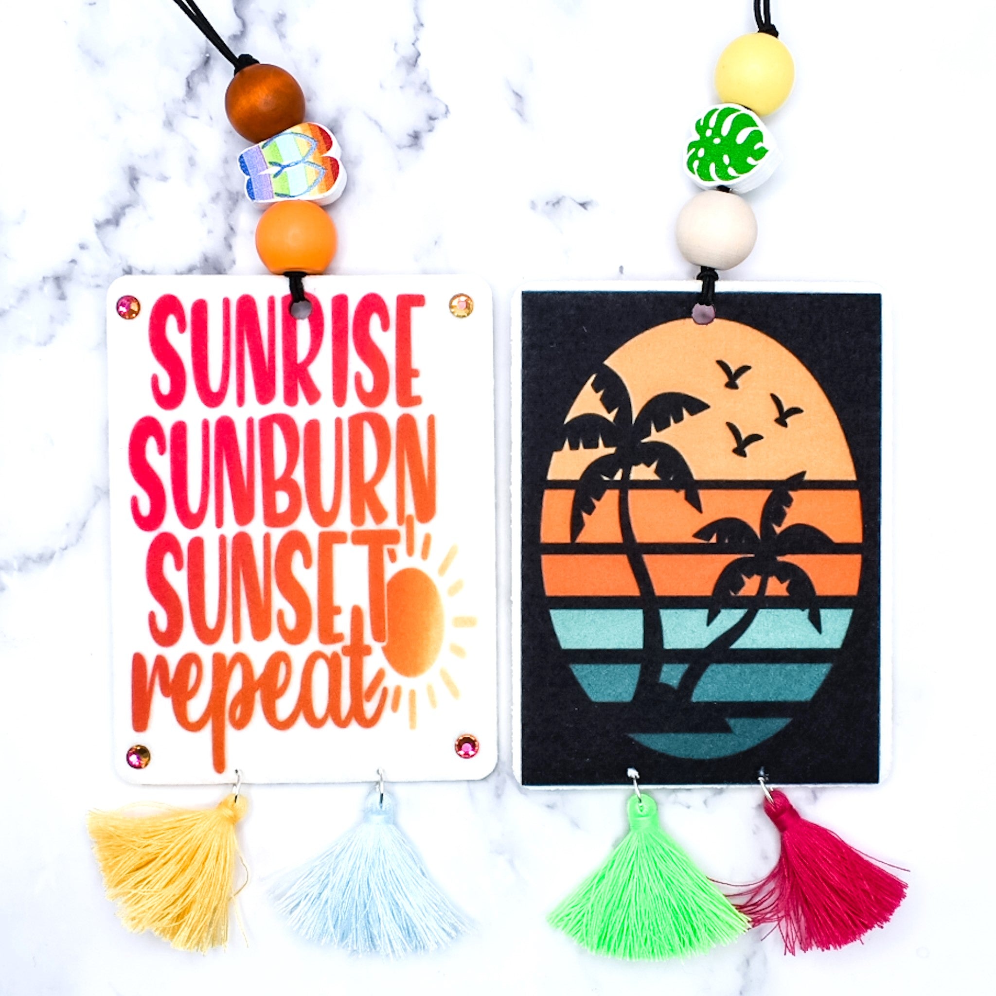 Our felt freshies are full of detail with a 2 sided print and an option for beads and tassels. Hang them in your car, office, or any small space. Once they fade, you can re-scent them with your favorite perfume, essential oil, etc. by applying them to the sides and allowing the oil/liquid to soak in. Bead, tassel, and string color may vary.