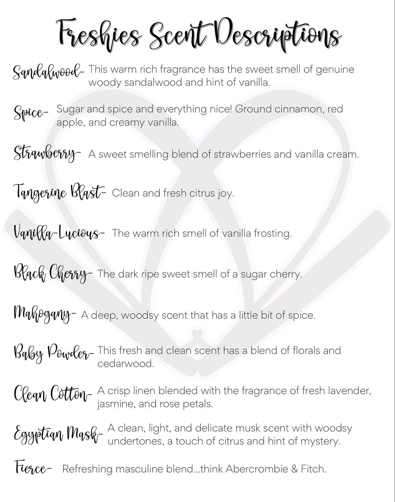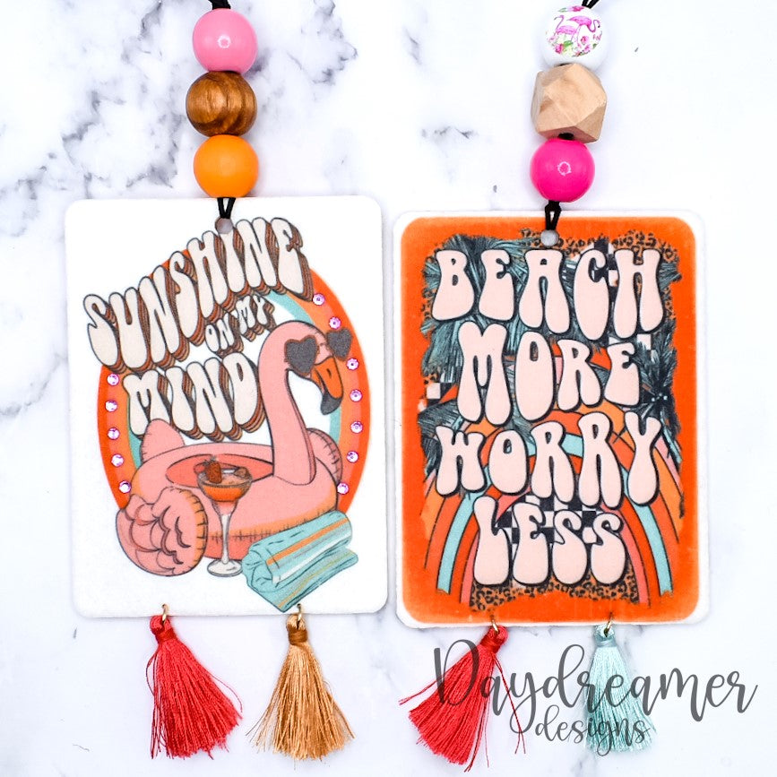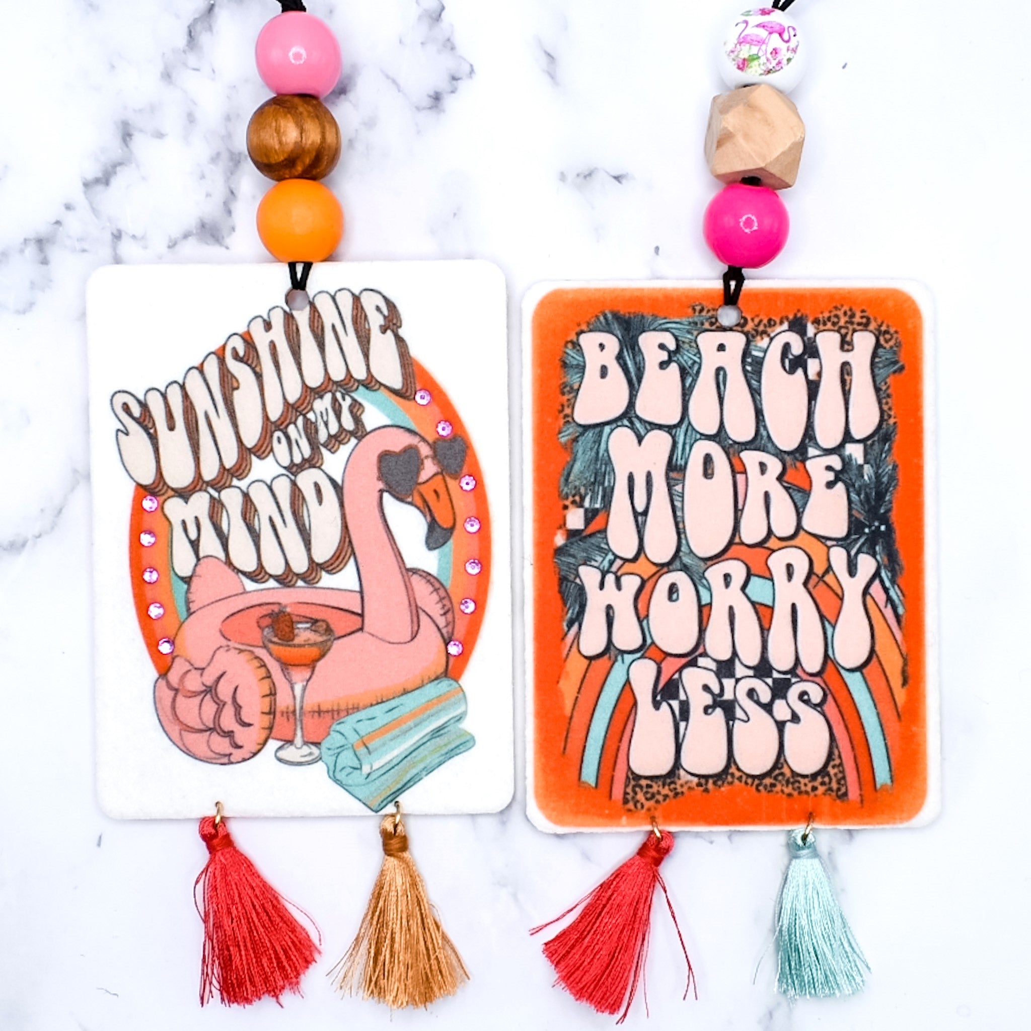 Our felt freshies are full of detail with a 2 sided print and an option for beads and tassels. Hang them in your car, office, or any small space. Once they fade, you can re-scent them with your favorite perfume, essential oil, etc. by applying them to the sides and allowing the oil/liquid to soak in. Bead, tassel, and string color may vary.