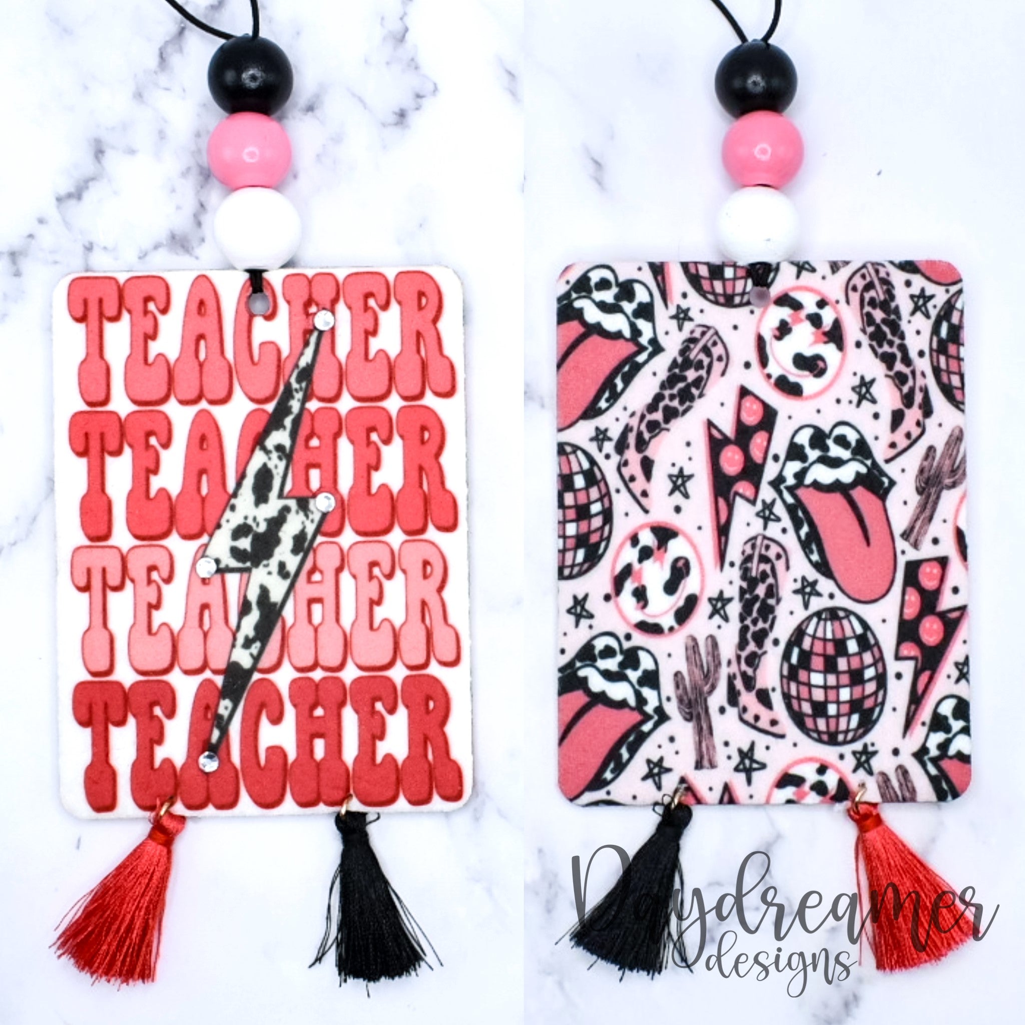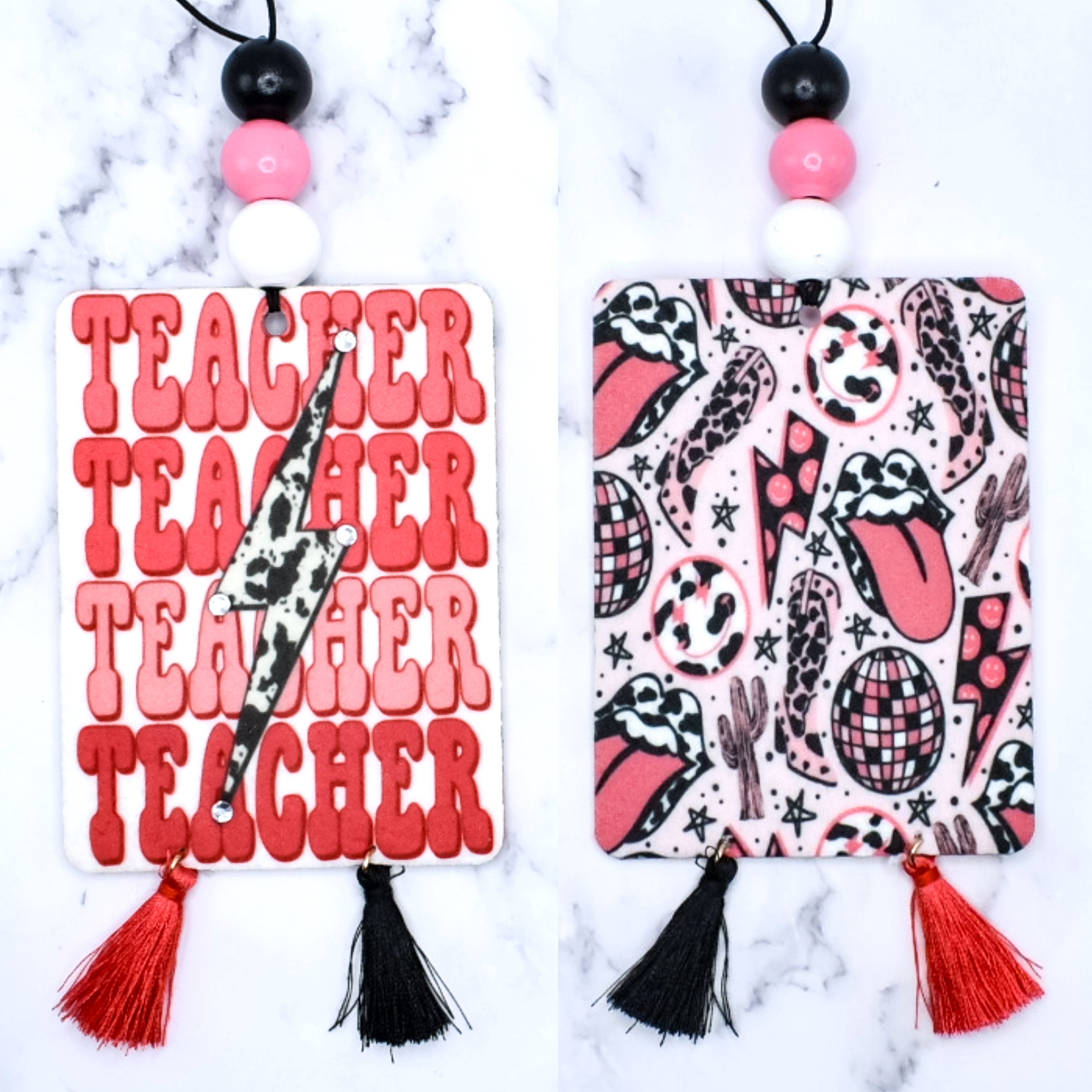 Our felt freshies are full of detail with a 2 sided print and an option for beads and tassels. Hang them in your car, office, or any small space. Once they fade, you can re-scent them with your favorite perfume, essential oil, etc. by applying them to the sides and allowing the oil/liquid to soak in. Bead, tassel, and string color may vary.